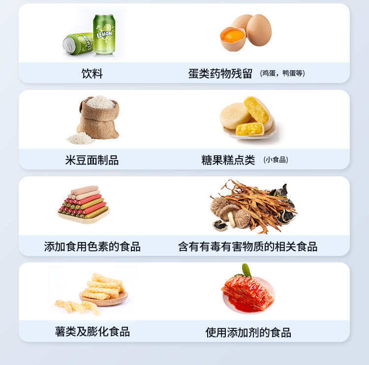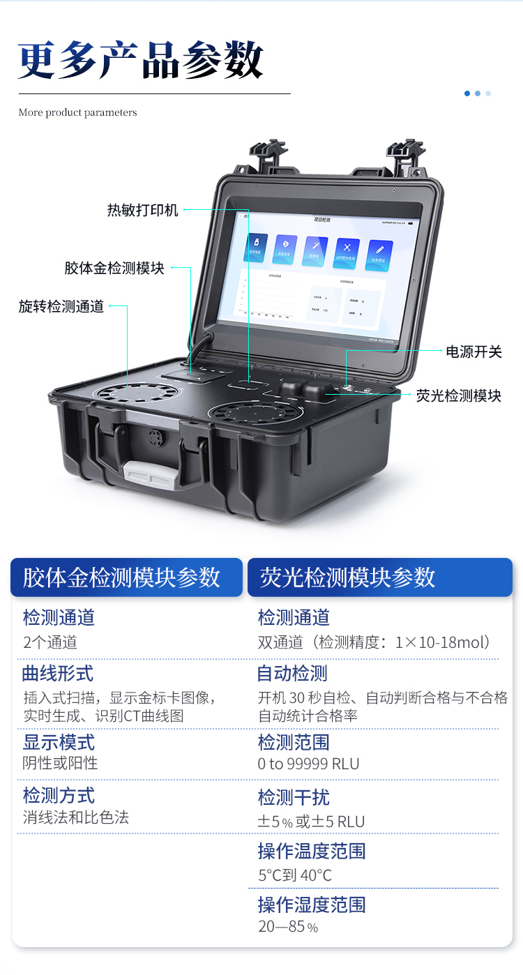 | 1. 功能構(gòu)成:主要包括分光光度模塊、新型農(nóng)殘檢測模塊、膠體金檢測模塊、熒光檢測模塊、數(shù)字化管理模塊等,所有模塊集成一體,可快速檢測200多種食品安全項目,如獸藥殘留、農(nóng)藥殘留、非法添加劑、細菌數(shù)值等指標。 | 2. 檢測樣品種類:餐具及廚房用品、瓜果蔬菜及其制品、水產(chǎn)品及其制品、畜禽產(chǎn)品及其制品、嬰幼兒乳品及奶粉制品、蜂蜜、糧油及其制品、調(diào)味品(食醋、醬油、味精、鹽等)、酒類茶葉及其制品、食用菌、飲料、蛋類藥物殘留(雞蛋,鴨蛋等)、米豆面制品、糖果糕點類(小食品)、薯類及膨化食品、瓶(桶)裝飲用水、添加食用色素的食品、使用添加劑的食品、含有有毒有害物質(zhì)的相關(guān)食品。 | 3、顯示屏幕:儀器采用15.6英寸液晶觸摸屏顯,搭配運行安卓智能操作系統(tǒng),主控芯片采用ARM Cortex-A7,RK3288/4核處理器,主頻1.88Ghz,操作方便,性能更強。 | 4、供電模式:儀器交直流兩用,直流12V供電,可連接車載電源,配18ah大容量充電鋰電池,電量可實時顯示,無外部電源條件下可持續(xù)工作至少 4 小時。 | 5、檢測通道:≥24通道;采用精密旋轉(zhuǎn)比色池設(shè)計,使用同芯片同光源校準精度,解決不同光源之間的誤差值,更加準確**,采用高精度進口四波長冷光源,每個通道均配置 410、520、590、630nm 波長光源,標配**的光路切換裝置,專利光路切換功能可實現(xiàn)64波長,并且所有檢測項目可實現(xiàn)所有通道同時檢測. | 6、通訊接口:配備無線通信模塊、4G(APN)通訊模塊、藍牙傳輸,同時具有雙USB接口以及RJ45網(wǎng)線接口,可以多方式實現(xiàn)數(shù)據(jù)保存及數(shù)據(jù)傳輸。 | 7、存儲方式:支持U盤存儲,兩個標準USB接口,免驅(qū)動安裝。檢測結(jié)果存儲容量20萬條以上,可生成Excel表格進行拷貝,并具有登錄保護功能。 | 8、操作系統(tǒng):儀器可在同一檢測界面自動對應(yīng)相關(guān)檢測通道,一次性選擇不少于11個樣品名稱,無需退出界面,節(jié)省操作時間。并可以對每個通道屬性和樣品信息單獨進行編輯,例如送檢單位、人員,檢測人員等,打印時勾選打印顯示。 | 9、數(shù)據(jù)集成系統(tǒng):設(shè)備首頁自動匯總分析檢測數(shù)據(jù),包含:周檢測數(shù)據(jù)、月檢測數(shù)據(jù),全部檢測總數(shù)量,包含檢測總數(shù),合格數(shù),不合格數(shù),以及相關(guān)柱形分析圖,各項檢測數(shù)據(jù)一目了然,無需電腦查詢,更加快捷直觀。 | 10、數(shù)據(jù)庫系統(tǒng):十幾項數(shù)據(jù)庫分類管理儀器:包含項目類型、項目數(shù)據(jù)、檢測數(shù)據(jù)、歷史記錄、國標信息、曲線信息、采樣信息、檢測信息、受檢信息、復(fù)核信息、圖表信息、光源校準信息、打印樣式信息、樣品庫信息等等,數(shù)據(jù)庫之間互相協(xié)調(diào)聯(lián)動保證數(shù)據(jù)的真實完整性。同時產(chǎn)品數(shù)據(jù)庫以及歷史檢測記錄支持一鍵檢索功能。 | 11、限量規(guī)判系統(tǒng):具有限量查詢、添加物質(zhì)合規(guī)判定系統(tǒng)。檢測出結(jié)果后,系統(tǒng)自動調(diào)用系統(tǒng)數(shù)據(jù)庫中相關(guān)國標進行比對判定,客觀顯示判定結(jié)果是否合格。 | 12、項目預(yù)設(shè)系統(tǒng):儀器具有任務(wù)預(yù)設(shè)模塊,一鍵提前預(yù)設(shè),給出方便快捷的新檢測方案,每一個任務(wù)分別可以設(shè)置不同的樣品、批次、編號、來源、備注、抽樣信息、檢測信息、受檢信息、復(fù)核信息等更多信息。樣品送檢時一鍵調(diào)取保存信息,并可多次調(diào)取,適用于大批量檢測業(yè)務(wù),可以大大提高檢測效率。 | 13、數(shù)據(jù)監(jiān)管系統(tǒng):同步對接監(jiān)管平臺,數(shù)據(jù)可局域網(wǎng)和互聯(lián)網(wǎng)數(shù)據(jù)上傳,檢測結(jié)果可直接傳至食品安全監(jiān)管平臺。進行區(qū)域食品安全監(jiān)管及大數(shù)據(jù)分析處理與數(shù)據(jù)統(tǒng)計,監(jiān)測區(qū)域食品安全長短期動態(tài)及問題預(yù)估、預(yù)警。 | 14.1、全新打印系統(tǒng):內(nèi)置全新打印機,新創(chuàng)自定義打印方式,可按需靈活勾選控制:產(chǎn)品合格證(國家農(nóng)業(yè)部標準要求),二維碼,抽樣信息、檢測信息,受檢信息、復(fù)核信息、抽樣日期、檢測日期等信息的打印。 | 14.2、A4紙版本報告打印功能:設(shè)備擁有兩種結(jié)果展示方式,可以自動生成A4打印模板和小票打印模板兩種樣式,可通過WiFi及網(wǎng)線等方式連接外置打印機可進行打印。 | 15、膠體金檢測模塊:采用單通道CMOS成像處理技術(shù)及膠體金免疫層析技術(shù),可讀取膠體金卡數(shù)據(jù),自動采集、處理分析,將檢測結(jié)果顯示,并可根據(jù)參考限值自動判斷檢測結(jié)果,可檢測常見的獸藥殘留、生物毒素、抗生素、違禁添加物等。 | 15.1、可即時檢測單聯(lián)卡及三聯(lián)卡; | 15.2、檢測通道:2個通道; | 15.3、檢測方式:消線法和比色法; | 15.4、顯示模式:陰性或陽性; | 15.5、曲線形式:插入式掃描方式,顯示金標卡圖像,實時生成、識別CT曲線圖,無需手動調(diào)整。兼容市場上其他金標卡,使用耗材不受限制。 | 16、熒光檢測模塊:快速檢測水質(zhì)中微生物、固體物細菌含量。利用“熒光素酶—熒光素體系”快速檢測三磷酸腺苷(ATP)。以ATP含量表明樣