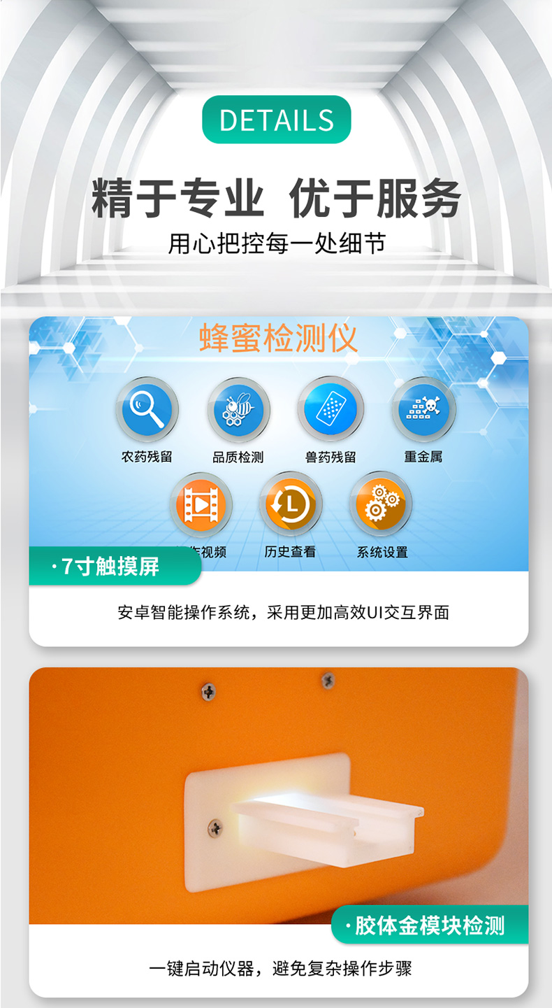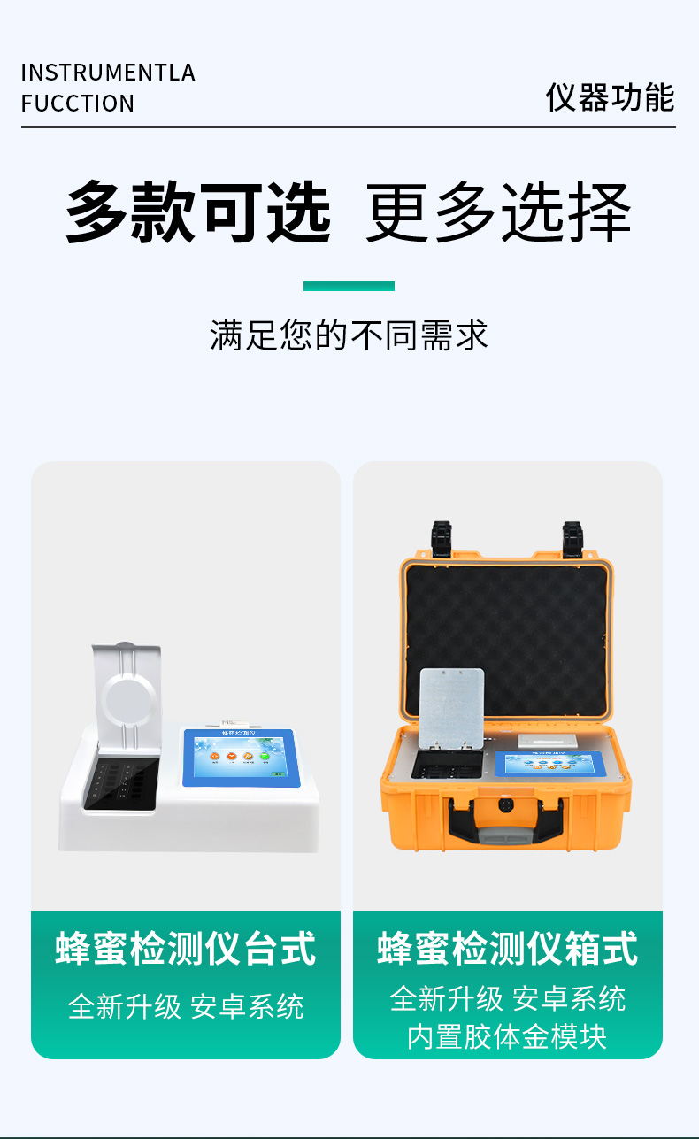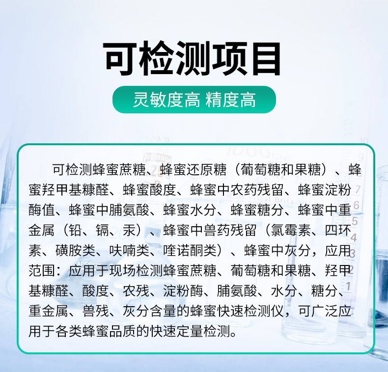 檢測項目:蜂蜜蔗糖、蜂蜜還原糖(葡萄糖和果糖)、蜂蜜羥甲基糠醛、蜂蜜酸度、蜂蜜中農(nóng)藥殘留、蜂蜜淀粉酶值、蜂蜜中脯氨酸、蜂蜜水分、蜂蜜糖分、蜂蜜中重金屬(鉛、鎘、汞)、蜂蜜中抗生素(氯霉素、四環(huán)素、磺胺類、呋喃類、喹諾酮類)、蜂蜜中灰分,可廣泛應(yīng)用于各類蜂蜜品質(zhì)的快速定量檢測。