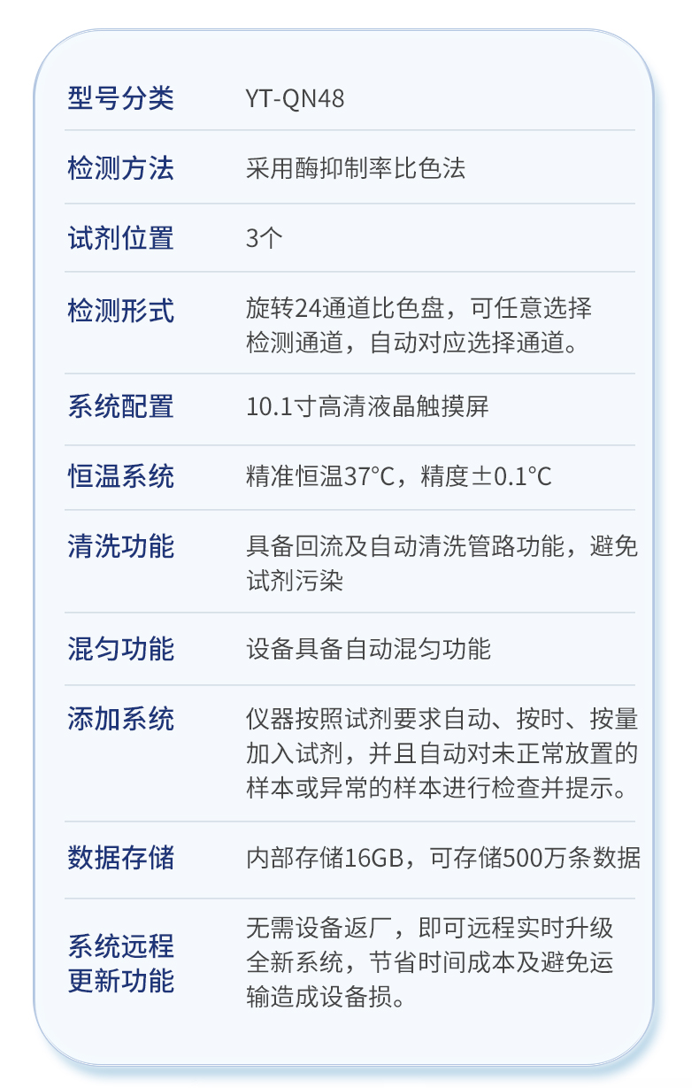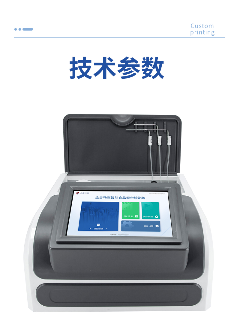 | 1. 試劑位置:3個(gè) | 2. 檢測(cè)形式:旋轉(zhuǎn)48通道比色盤,可任意選擇檢測(cè)通道,自動(dòng)對(duì)應(yīng)選擇通道。 | 3. 系統(tǒng)配置:10.1寸高清液晶觸摸屏,采用ARM Cortex-A7,RK3288/4核處理器,運(yùn)行內(nèi)存1GB。Android7.1.1 系統(tǒng)分辨率1280×800。 | 4.恒溫系統(tǒng):具有自動(dòng)加溫溫控系統(tǒng),精準(zhǔn)恒溫37℃,精度±0.1℃。 | 5.添加系統(tǒng):儀器按照試劑要求自動(dòng)、按時(shí)、按量加入試劑,并且自動(dòng)對(duì)未正常放置的樣本或異常的樣本進(jìn)行檢查并提示。 | 6.清洗功能:儀器具備回流及自動(dòng)清洗管路功能,避免試劑污染。 | 7.混勻功能:設(shè)備具備自動(dòng)混勻功能。 | 8.光源校準(zhǔn):設(shè)備可自動(dòng)校準(zhǔn),確保檢測(cè)準(zhǔn)確度。 | 9.實(shí)時(shí)監(jiān)控:儀器測(cè)試過程中屏幕顯示運(yùn)行狀態(tài),可實(shí)時(shí)查看。 | 10.數(shù)據(jù)存儲(chǔ):內(nèi)部存儲(chǔ)16GB,可存儲(chǔ)500萬條數(shù)據(jù)。 | 11.樣品多選功能:設(shè)備具備樣品一鍵多選功能,選擇樣品自動(dòng)匹配檢測(cè)通道。 | 12.項(xiàng)目預(yù)設(shè):可提前設(shè)置單個(gè)及多個(gè)相同或不相同的檢測(cè)任務(wù),可單次或者多次調(diào)取,減少檢測(cè)時(shí)間。 | 13.自定義打印系統(tǒng):內(nèi)置自定義打印系統(tǒng),可按需靈活設(shè)置開啟或關(guān)閉:產(chǎn)品合格證(國(guó)家農(nóng)業(yè)部標(biāo)準(zhǔn)),二維碼,抽樣信息、檢測(cè)信息,受檢信息等信息的打印。 | 14.A4版本報(bào)告打印功能:設(shè)備可自動(dòng)生成A4版報(bào)告,A4報(bào)告帶二維碼,可掃描二維碼生成電子版,并可識(shí)別真?zhèn)巍?/td> | 15.傳輸方式:儀器配備無線通信模塊: 4G(APN)通訊模塊、Wifi模塊,藍(lán)牙傳輸模塊,同時(shí)具有USB接口以及RJ45接口能以多種方式實(shí)現(xiàn)數(shù)據(jù)保存和數(shù)據(jù)傳輸功能,設(shè)備數(shù)據(jù)可以同步上傳至平臺(tái)。 | 16.數(shù)據(jù)監(jiān)管系統(tǒng):設(shè)備自帶監(jiān)管平臺(tái),并可同步對(duì)接監(jiān)管平臺(tái),數(shù)據(jù)可局域網(wǎng)和互聯(lián)網(wǎng)數(shù)據(jù)上傳,檢測(cè)結(jié)果可直接傳至食品安全監(jiān)管平臺(tái)。達(dá)到食品安全問題預(yù)估、預(yù)警。 | 17.系統(tǒng)遠(yuǎn)程更新功能:無需設(shè)備返廠,即可遠(yuǎn)程實(shí)時(shí)升級(jí)全新系統(tǒng),節(jié)省時(shí)間成本及避免運(yùn)輸造成設(shè)備損。 |