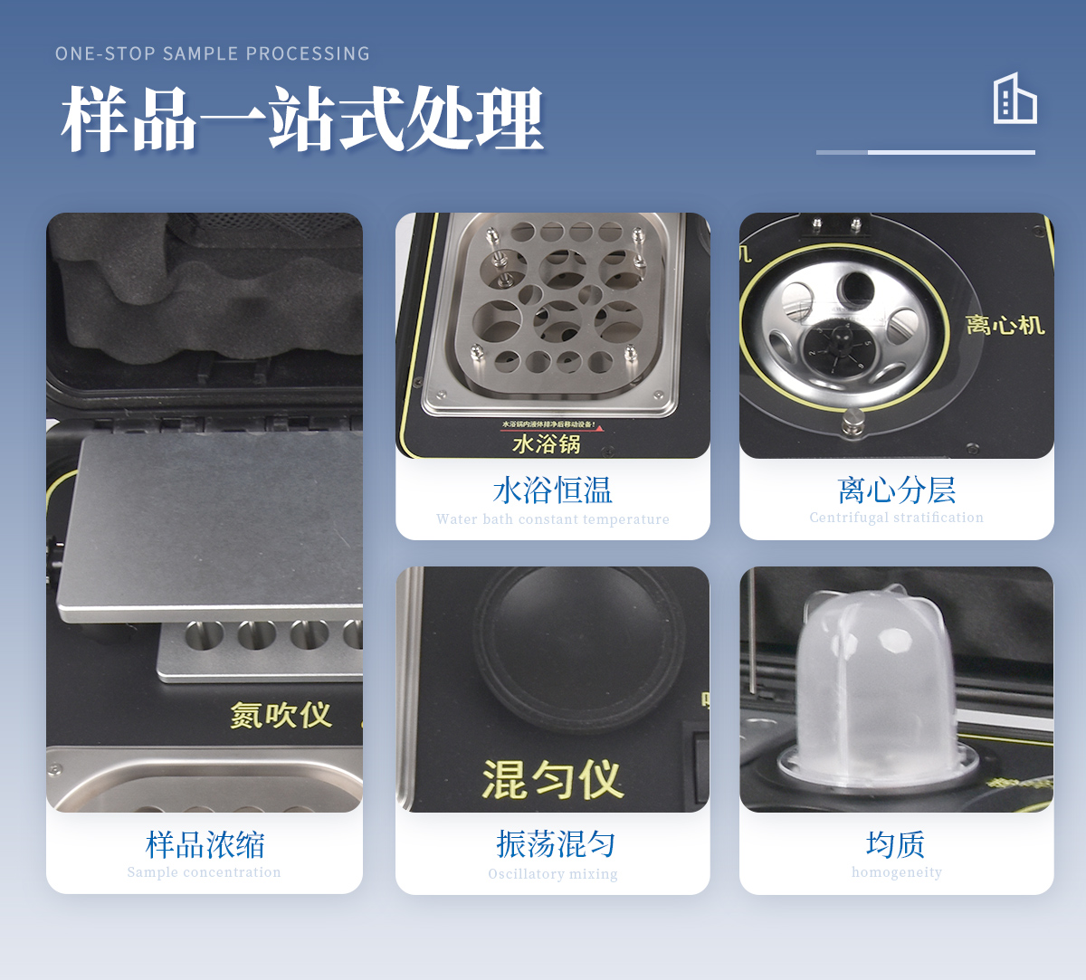 | 1、功能緊湊,集成五種樣品前處理常用的功能,完成樣品一站式處理。 | 2、結(jié)構(gòu)穩(wěn)固,機(jī)箱采用***工程塑料,具備**的抗沖擊性、耐腐蝕性、便攜性。 | 3、操作穩(wěn)定,機(jī)器采用五寸全彩色液晶屏,功能指示性強(qiáng),用戶(hù)操作均為實(shí)體開(kāi)關(guān),杜絕佩戴手套和液體噴濺時(shí)的操作失效。 |