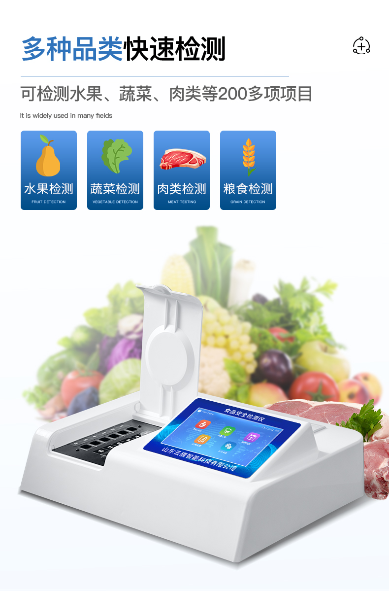 可快速檢測各類食品中的甲醛、二氧化硫、亞硝酸鹽、吊白塊的含量,儀器預留其他項目檢測程序和端口,根據日后需求可方便的自主增加檢測項目。