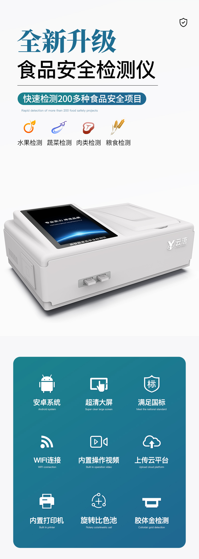 山東云唐智能科技有限公司生產(chǎn)的高智能食品安全檢測儀為集成化食品安全快速檢測分析設(shè)備,采用臺式一體化設(shè)計,可快速檢測200多種食品安全項目,包含非食用化學(xué)物質(zhì)、濫用食品添加劑、農(nóng)藥殘留、獸藥殘留、重金屬、病害肉、營養(yǎng)強(qiáng)化劑、抗生素類殘留、激素類殘留、真菌毒素類殘留、化學(xué)類殘留等項目的定性定量檢測。