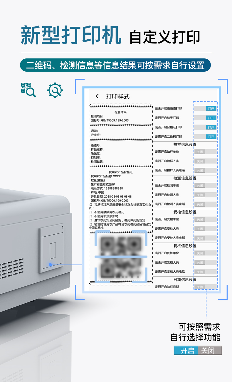 | 儀器采用臺式一體化系統(tǒng)檢測技術(shù),將分光光度模塊、膠體金檢測模塊、新型農(nóng)殘檢測模塊、數(shù)字化管理模塊、無線通訊模塊高度集成于一體,支持檢測200種食品安全檢測項目,同時預(yù)留升級檢測方法。 | 儀器檢測模塊標(biāo)準(zhǔn)化、智能化,可隨意自由組合。檢測箱體內(nèi)置多個標(biāo)準(zhǔn)檢測單元,檢測模塊可以調(diào)整配置。 | 顯示屏幕:儀器采用10.1英寸豎向液晶觸摸屏顯,搭配運(yùn)行安卓智能操作系統(tǒng),主控芯片采用ARM Cortex-A7,RK3288/4核處理器,主頻1.88Ghz,操作方便,性能更強(qiáng)。 | 檢測通道:≥12通道;采用精密旋轉(zhuǎn)比色池設(shè)計,使用同芯片同光源校準(zhǔn)精度,解決不同光源之間的誤差值。1-12通道間誤差0.1%。(***:**202022821055.2) | 儀器光源:高精度進(jìn)口四波長冷光源,每個通道均配置 410、520、590、630nm 波長光源,標(biāo)配**的光路切換裝置,專利光路切換功能可實(shí)現(xiàn)64波長,并且所有檢測項目可實(shí)現(xiàn)所有通道同時檢測。 | 設(shè)備可一鍵校準(zhǔn),自動保存校準(zhǔn)數(shù)據(jù),自動對比校驗(yàn),得到精準(zhǔn)光源,采用Android SP存儲數(shù)據(jù),光源數(shù)據(jù)永不丟失,方便每一次使用。 | 通訊接口: 配備無線通信模塊、可選配4G(APN)通訊模塊和藍(lán)牙傳輸,同時具有雙USB接口以及RJ45網(wǎng)線接口,可以多方式實(shí)現(xiàn)數(shù)據(jù)保存及數(shù)據(jù)傳輸。 | 存儲方式: 支持U盤存儲,標(biāo)準(zhǔn)USB接口,免驅(qū)動安裝。檢測結(jié)果存儲容量20萬條以上,可生成Excel表格進(jìn)行拷貝,并具有登錄保護(hù)功能。 | 智能化操作系統(tǒng): | 操作系統(tǒng):儀器可在同一檢測界面自動對應(yīng)相關(guān)檢測通道,一次性選擇1-12個樣品名稱,無需退出界面,節(jié)省操作時間。并可以對每個通道屬性和樣品信息單獨(dú)進(jìn)行編輯,例如送檢單位、人員,檢測人員等,打印時勾選打印顯示。 | 數(shù)據(jù)集成系統(tǒng):設(shè)備首頁自動匯總分析檢測數(shù)據(jù),包含:周檢測數(shù)據(jù)、月檢測數(shù)據(jù),全部檢測總數(shù)量,均包含檢測總數(shù),合格數(shù),不合格數(shù),以及相關(guān)柱形分析圖,各項檢測數(shù)據(jù)一目了然,無需電腦查詢,更加快捷直觀。 | 數(shù)據(jù)庫系統(tǒng):十幾項數(shù)據(jù)庫分類管理儀器:包含項目類型、項目數(shù)據(jù)、檢測數(shù)據(jù)、歷史記錄、國標(biāo)信息、曲線信息、采樣信息、檢測信息、受檢信息、復(fù)核信息、圖表信息、光源校準(zhǔn)信息、打印樣式信息、樣品庫信息等等,數(shù)據(jù)庫之間互相協(xié)調(diào)聯(lián)動保證數(shù)據(jù)的真實(shí)完整性。同時產(chǎn)品數(shù)據(jù)庫以及歷史檢測記錄支持一鍵檢索功能。 | 限量規(guī)判系統(tǒng):具有限量查詢、添加物質(zhì)合規(guī)判定系統(tǒng)。檢測出結(jié)果后,系統(tǒng)自動調(diào)用系統(tǒng)數(shù)據(jù)庫中相關(guān)國標(biāo)進(jìn)行比對判定,客觀顯示判定結(jié)果是否合格。 | 項目預(yù)設(shè)系統(tǒng):儀器具有任務(wù)預(yù)設(shè)模塊,一鍵提前預(yù)設(shè),給出方便快捷的新檢測方案,每一個任務(wù)分別可以設(shè)置不同的樣品、批次、編號、來源、備注、抽樣信息、檢測信息、受檢信息、復(fù)核信息等更多信息。樣品送檢時一鍵調(diào)取保存信息,并可多次調(diào)取,大大提高檢測效率。 | 數(shù)據(jù)監(jiān)管系統(tǒng):同步對接監(jiān)管平臺,數(shù)據(jù)可局域網(wǎng)和互聯(lián)網(wǎng)數(shù)據(jù)上傳,檢測結(jié)果可選擇直接傳至食品安全監(jiān)管平臺。進(jìn)行區(qū)域食品安全監(jiān)管及大數(shù)據(jù)分析處理與數(shù)據(jù)統(tǒng)計,檢測區(qū)域食品安全長短期動態(tài),達(dá)到食品安全問題預(yù)估、預(yù)警。 | 打印系統(tǒng):內(nèi)置全新打印機(jī),新創(chuàng)自定義打印方式,可按需靈活勾選控制:產(chǎn)品合格證(國家農(nóng)業(yè)部標(biāo)準(zhǔn)要求),二維碼,抽樣信息、檢測信息,受檢信息、復(fù)核信息、抽樣日期、檢測日期等信息的打印。 | 供電模式:儀器交直流兩用,直流12V供電,可連接車載電源,可配6ah大容量充電鋰電池,電量可實(shí)時顯示,方便戶外流動測試。 | 膠體金檢測模塊:采用單通道CMOS成像處理技術(shù)及膠體金免疫層析技術(shù),可讀取膠體金卡數(shù)據(jù),自動采集、處理分析,將檢測結(jié)果顯示,并可根據(jù)參考限值自動判斷檢測結(jié)果,可檢測常見的獸藥殘留、生物毒素、抗生素、違禁添加物等。 | 探測技術(shù):CMOS成像探測; | 檢測通道:1個通道; | 檢測方式:消線法和比色法; | 顯示模式:陰性或陽性; | 曲線形式:直插式掃描方式,顯示金標(biāo)卡圖像,實(shí)時生成、識別CT曲線圖,無需手動調(diào)整,完成檢測后自動退出檢測卡。兼容市場上其他金標(biāo)卡,使用耗材不受限制。 | 儀器具備遠(yuǎn)程升級功能,可定向分客戶分儀器更新,開機(jī)后自動更新,并可持續(xù)性免費(fèi)更新系統(tǒng)版本,無需像傳統(tǒng)產(chǎn)品返廠更新,節(jié)省時間及人力成本并避免了物流運(yùn)輸返廠升級導(dǎo)致設(shè)備損壞的潛在風(fēng)險。 |