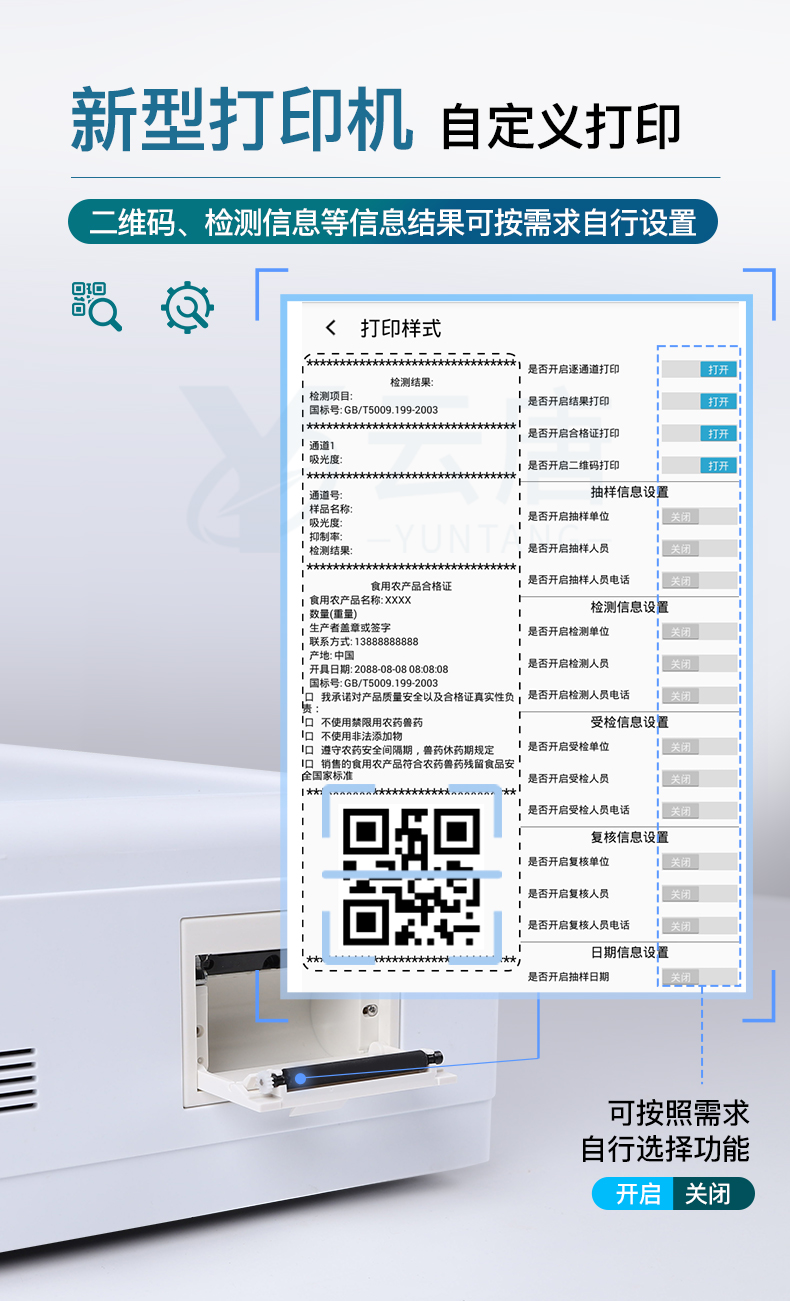 | 儀器采用臺式一體化系統檢測技術,將分光光度模塊、膠體金檢測模塊、新型農殘檢測模塊、數字化管理模塊、無線通訊模塊高度集成于一體,支持檢測200種食品安全檢測項目,同時預留升級檢測方法。 | 儀器檢測模塊標準化、智能化,可隨意自由組合。檢測箱體內置多個標準檢測單元,檢測模塊可以調整配置。 | 顯示屏幕:儀器采用10.1英寸豎向液晶觸摸屏顯,搭配運行安卓智能操作系統,主控芯片采用ARM Cortex-A7,RK3288/4核處理器,主頻1.88Ghz,操作方便,性能更強。 | 檢測通道:≥12通道;采用精密旋轉比色池設計,使用同芯片同光源校準精度,解決不同光源之間的誤差值。1-12通道間誤差0.1%。(***:**202022821055.2) | 儀器光源:高精度進口四波長冷光源,每個通道均配置 410、520、590、630nm 波長光源,標配**的光路切換裝置,專利光路切換功能可實現64波長,并且所有檢測項目可實現所有通道同時檢測。 | 設備可一鍵校準,自動保存校準數據,自動對比校驗,得到精準光源,采用Android SP存儲數據,光源數據永不丟失,方便每一次使用。 | 通訊接口: 配備無線通信模塊、可選配4G(APN)通訊模塊和藍牙傳輸,同時具有雙USB接口以及RJ45網線接口,可以多方式實現數據保存及數據傳輸。 | 存儲方式: 支持U盤存儲,標準USB接口,免驅動安裝。檢測結果存儲容量20萬條以上,可生成Excel表格進行拷貝,并具有登錄保護功能。 | 智能化操作系統: | 操作系統:儀器可在同一檢測界面自動對應相關檢測通道,一次性選擇1-12個樣品名稱,無需退出界面,節省操作時間。并可以對每個通道屬性和樣品信息單獨進行編輯,例如送檢單位、人員,檢測人員等,打印時勾選打印顯示。 | 數據集成系統:設備首頁自動匯總分析檢測數據,包含:周檢測數據、月檢測數據,全部檢測總數量,均包含檢測總數,合格數,不合格數,以及相關柱形分析圖,各項檢測數據一目了然,無需電腦查詢,更加快捷直觀。 | 數據庫系統:十幾項數據庫分類管理儀器:包含項目類型、項目數據、檢測數據、歷史記錄、國標信息、曲線信息、采樣信息、檢測信息、受檢信息、復核信息、圖表信息、光源校準信息、打印樣式信息、樣品庫信息等等,數據庫之間互相協調聯動保證數據的真實完整性。同時產品數據庫以及歷史檢測記錄支持一鍵檢索功能。 | 限量規判系統:具有限量查詢、添加物質合規判定系統。檢測出結果后,系統自動調用系統數據庫中相關國標進行比對判定,客觀顯示判定結果是否合格。 | 項目預設系統:儀器具有任務預設模塊,一鍵提前預設,給出方便快捷的新檢測方案,每一個任務分別可以設置不同的樣品、批次、編號、來源、備注、抽樣信息、檢測信息、受檢信息、復核信息等更多信息。樣品送檢時一鍵調取保存信息,并可多次調取,大大提高檢測效率。 | 數據監管系統:同步對接監管平臺,數據可局域網和互聯網數據上傳,檢測結果可選擇直接傳至食品安全監管平臺。進行區域食品安全監管及大數據分析處理與數據統計,檢測區域食品安全長短期動態,達到食品安全問題預估、預警。 | 全新打印系統:內置全新打印機,新創自定義打印方式,可按需靈活勾選控制:產品合格證(國家農業部標準要求),二維碼,抽樣信息、檢測信息,受檢信息、復核信息、抽樣日期、檢測日期等信息的打印。 | A4紙版本報告打印功能(可選配):設備擁有兩種結果展示方式,可以自動生成A4打印模板和小票打印模板兩種樣式,可通過WiFi及網線等方式鏈接外置打印機可進行打印。 | 供電模式:儀器交直流兩用,直流12V供電,可連接車載電源,可配6ah大容量充電鋰電池,電量可實時顯示,方便戶外流動測試。 | 膠體金檢測模塊:采用三通道CMOS成像處理技術及膠體金免疫層析技術,可同時讀取三個膠體金卡數據,自動采集、處理分析,將檢測結果顯示,并可根據參考限值自動判斷檢測結果,可檢測常見的獸藥殘留、生物毒素、抗生素、違禁添加物等。 | 探測技術:CMOS成像探測; | 檢測通道:3通道,可同時讀取3個膠體金卡數據; | 檢測方式:消線法和比色法; | 顯示模式:陰性或陽性; | 曲線形式:直插式掃描方式,顯示金標卡圖像,實時生成、識別CT曲線圖,無需手動調整,完成檢測后自動退出檢測卡。兼容市場上其他金標卡,使用耗材不受限制。 | 儀器具備遠程升級功能,可定向分客戶分儀器更新,開機后自動更新,并可持續性免費更新系統版本,無需像傳統產品返廠更新,節省時間及人力成本并避免了物流運輸返廠升級導致設備損壞的潛在風險。 |