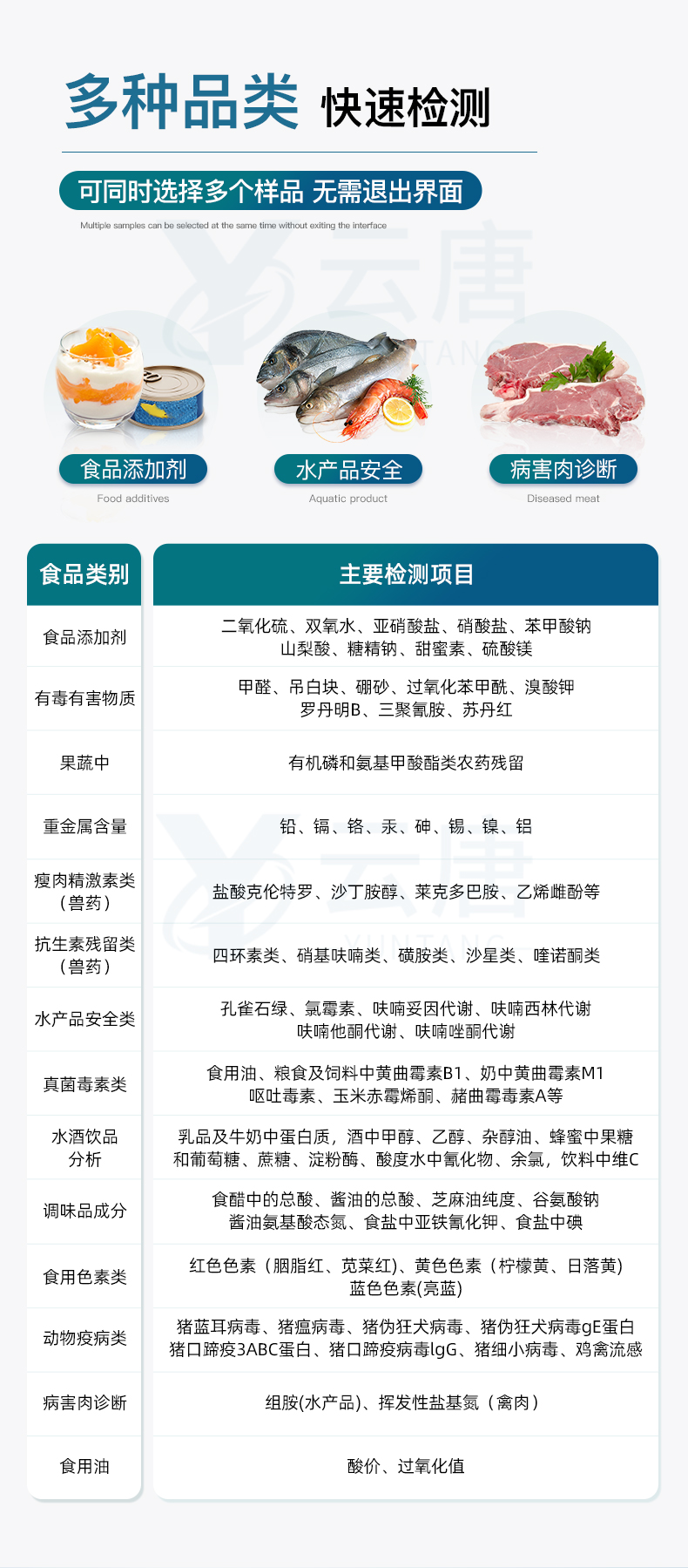 | 食品添加劑:二氧化硫、雙氧水、亞硝酸鹽、苯甲酸鈉、硝酸鹽、山梨酸鉀、山梨酸、安賽蜜、糖精鈉、甜蜜素、木耳硫酸鎂、茶多酚等 | 有毒有害物質:甲醛、吊白塊、硼砂、面粉中鋁、硫酸鋁鉀、過氧化苯甲酰、溴酸鉀、羅丹明B、蘇丹紅、工業堿、尿素、明礬等 | 果蔬:農藥殘留 | 病害肉:組胺、揮發性鹽基氮 | 重金屬含量:鉛、鎘、鉻、汞、砷、錫、鎳、鋁等 | 水產品安全類:孔雀石綠、氯霉素、呋喃妥因、呋喃西林、呋喃它酮、呋喃唑酮等 | 瘦肉精激素類(獸藥):鹽酸克倫特羅、沙丁胺醇、萊克多巴胺、己烯雌酚等 | 抗生素殘留:四環素類、硝基呋喃類、磺胺類、β-興奮劑類、沙星類、磺胺類、喹諾酮類,甲砜霉素,氟苯尼考,金剛烷胺、替米考星、慶大霉素、林可霉素、鏈霉素、恩諾沙星、環丙沙星、頭孢啦啶、青霉素、阿莫西林等 | 真菌毒素類:食用油、糧食及飼料中黃曲霉毒素B1、黃曲霉毒素總量,奶中黃曲霉毒素M1、嘔吐毒素、玉米赤霉烯酮、赭曲霉毒素A、T2毒素、伏馬毒素等 | 酒類及乳品牛奶中蛋白質:酒中甲醇、乙醇、乳品及牛奶中蛋白質、乳品硫氰酸鈉、三聚氰胺 | 調味品成分:食醋的總酸、醬油的總酸、芝麻油純度、谷氨酸鈉、醬油氨基酸態氮、食鹽中亞鐵氰化鉀、食鹽中碘等 | 食用色素類:紅色色素(胭脂紅、莧菜紅、誘惑紅)、黃色色素(檸檬黃、日落黃、堿性橙)、藍色色素(亮藍、靛藍)等 | 動物疫病類:禽流感、新城疫、牛羊口蹄疫、牛羊結核病、牛羊包蟲、牛羊布病、小反芻獸、豬藍耳病毒、豬瘟病毒、豬偽狂犬病毒、豬細小、豬圓環、犬細小病毒、犬瘟熱病毒、犬狂犬病毒等 | 蜂蜜中:果糖和葡萄糖、蔗糖、淀粉酶、酸度等 | 食用油檢測:過氧化值、酸價等 | 蛋類藥物殘留:氯霉素,四環素,磺胺類,喹諾酮類,呋喃西林,呋喃它酮,呋喃妥因,呋喃唑酮,氟苯尼考,阿莫西林、頭孢氨芐、紅霉素、鏈霉素等 |