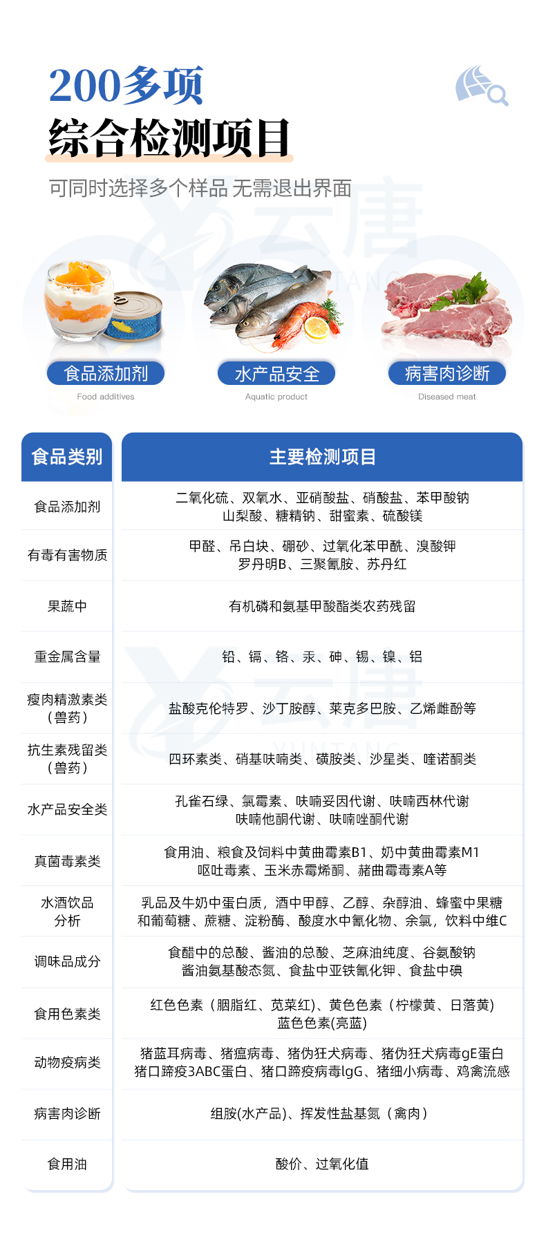 | 食品添加劑:二氧化硫、雙氧水、亞硝酸鹽、硝酸鹽、苯甲酸鈉、山梨酸鉀、糖精鈉、甜蜜素、木耳硫酸鎂等 | 有毒有害物質:甲醛、吊白塊、硼砂、過氧化苯甲酰、溴酸鉀、羅丹明B、三聚氰胺、蘇丹紅、工業堿、尿素、明礬等 | 果蔬:農藥殘留(酶抑制率法) | 病害肉診斷:組胺、揮發性鹽基氮; | 重金屬含量:鉛、鎘、鉻、汞、砷、錫、鎳、鋁等; | 食用油脂: 過氧化值、酸價等 | 瘦肉精激素類(獸藥):鹽酸克倫特羅、沙丁胺醇、萊克多巴胺、己烯雌酚等 | 抗生素殘留類(獸藥):四環素類、硝基呋喃類、磺胺類、β-興奮劑類、沙星類、磺胺類、喹諾酮類,甲砜霉素,氟苯尼考,金剛烷胺、替米考星、慶大霉素、林可霉素、鏈霉素、恩諾沙星、環丙沙星、頭孢啦啶、青霉素、阿莫西林等 | 真菌毒素類:食用油、糧食及飼料中黃曲霉毒素B1、黃曲霉毒素總量,奶中黃曲霉毒素M1、嘔吐毒素、玉米赤霉烯酮、赭曲霉毒素A、T2毒素、伏馬毒素等; | 水酒飲品分析:酒中甲醇、乙醇、乳品及牛奶中蛋白質, | 調味品成分:食醋的總酸、醬油的總酸、芝麻油純度、谷氨酸鈉、醬油氨基酸態氮、食鹽中亞鐵氰化鉀、食鹽中碘等 | 食用色素類:紅色色素(胭脂紅、莧菜紅、赤蘚紅、誘惑紅)、黃色色素(檸檬黃、日落黃)、藍色色素(亮藍)等 | 動物疫病類:禽流感、新城疫、牛羊口蹄疫、牛羊結核病、牛羊包蟲、牛羊布病、小反芻獸、豬藍耳病毒、豬瘟病毒、豬偽狂犬病毒、豬細小、豬圓環、犬細小病毒、犬瘟熱病毒、犬狂犬病毒等; | 蜂蜜成分:果糖和葡萄糖、蔗糖、淀粉酶、酸度等 | 水產品安全類:孔雀石綠、氯霉素、呋喃妥因、呋喃西林、呋喃它酮、呋喃唑酮等 | 蛋類藥物殘留:氯霉素,四環素,磺胺類,喹諾酮類,呋喃西林,呋喃它酮,呋喃妥因,呋喃唑酮,氟苯尼考,阿莫西林、頭孢氨芐、紅霉素、鏈霉素等 |