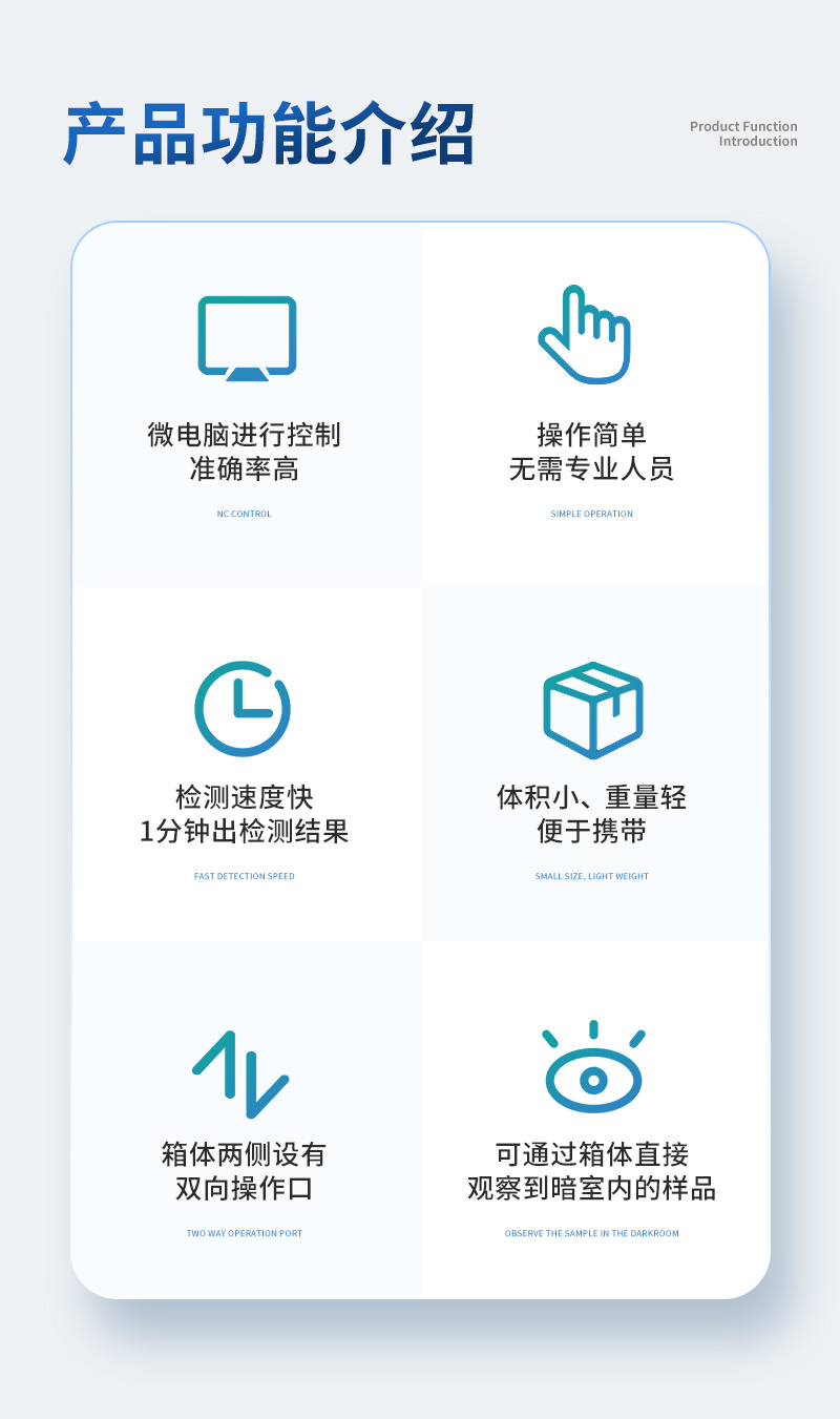 ★1、采用微電腦進行控制,準確率高 ★2、操作簡單,無需專業人員★3、檢測速度快,1分鐘出檢測結果★4、體積小、重量輕、便于攜帶