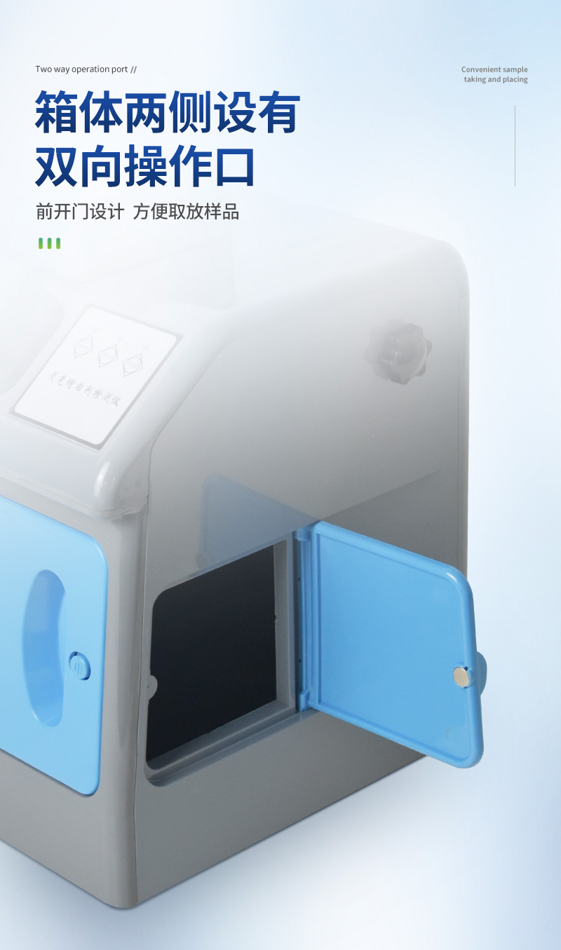 ★依據行標:NY/T1257-2006 ★儀器箱體兩側設有雙向操作口,前開門設計,方便取放樣品。 ★用戶可通過箱體直接觀察到暗室內的樣品。★特別設計防紫外線觀察口,使操作人員避免紫外線損傷。★紫外短波波長:254nm ★紫外長波波長:365nm ★可見光源 ★紫外濾色片尺寸:200×50mm ★工作電源: 220V交流電源★使用溫度: 0℃-40℃ ★使用濕度:<90% (40℃)            ★儀器功耗: 20W★外型尺寸:300×200×290mm