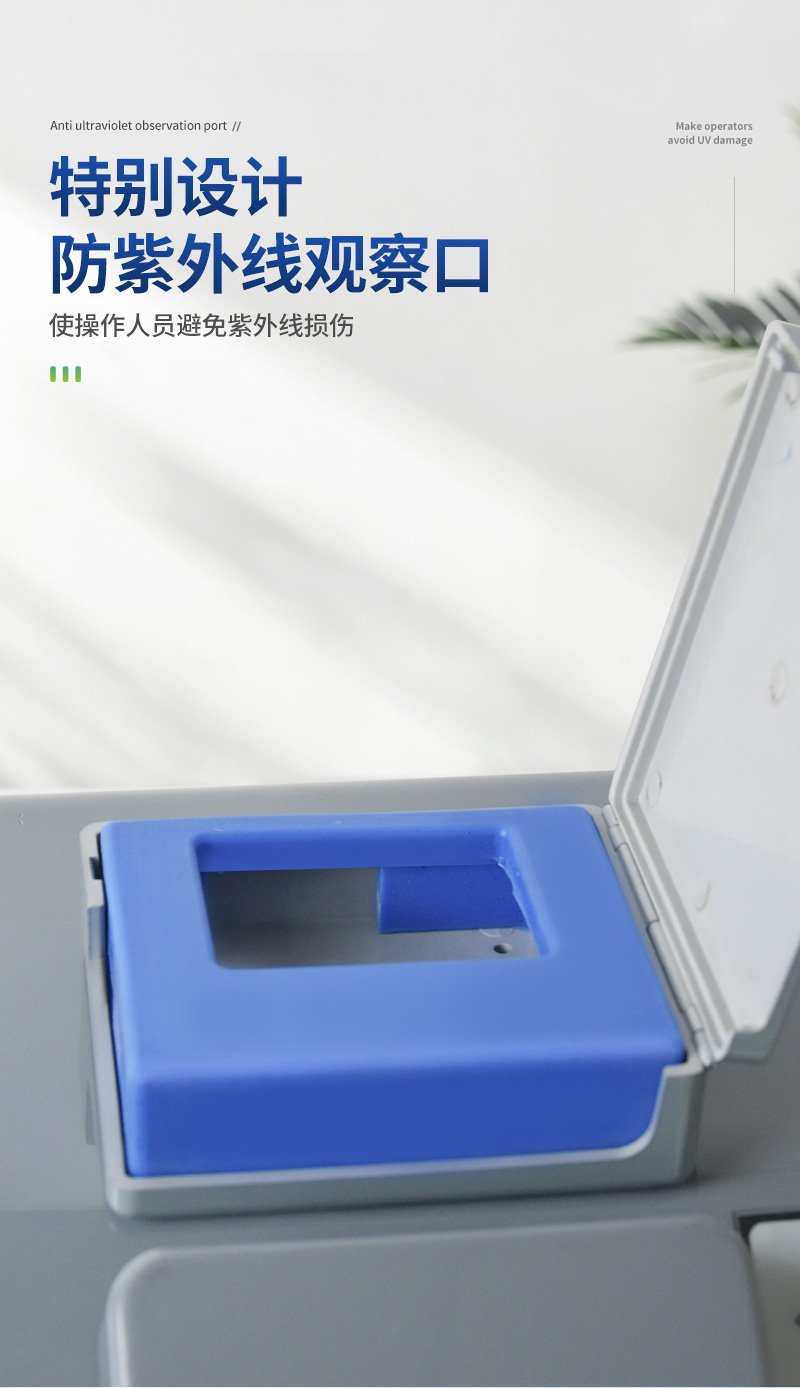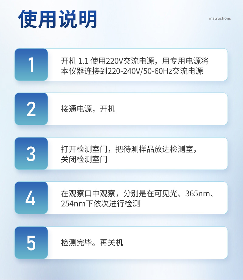 1、開機 1.1 使用220V交流電源,用專用電源將本儀器連接到220-240V/50-60Hz交流電源。2、操作程序2.1 接通電源,開機2.2 打開檢測室門,把待測樣品放進檢測室,關閉檢測室門2.3 在觀察口中觀察,分別是在可見光、365nm、254nm下依次進行檢測。2.4 檢測完畢。再關機。