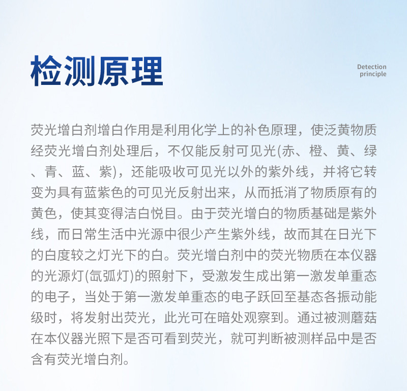 熒光增白劑增白作用是利用化學上的補色原理,使泛黃物質經熒光增白劑處理后,不僅能反射可見光(赤、橙、黃、綠、青、藍、紫),還能吸收可見光以外的紫外線,并將它轉變為具有藍紫色的可見光反射出來,從而抵消了物質原有的黃色,使其變得潔白悅目。由于熒光增白的物質基礎是紫外線,而日常生活中光源中很少產生紫外線,故而其在日光下的白度較之燈光下的白。熒光增白劑中的熒光物質在本儀器的光源燈(氙弧燈)的照射下,受激發生成出第一激發單重態的電子,當處于第一激發單重態的電子躍回至基態各振動能級時,將發射出熒光,此光可在暗處觀察到。通過被測蘑菇在本儀器光照下是否可看到熒光,就可判斷被測樣品中是否含有熒光增白劑。