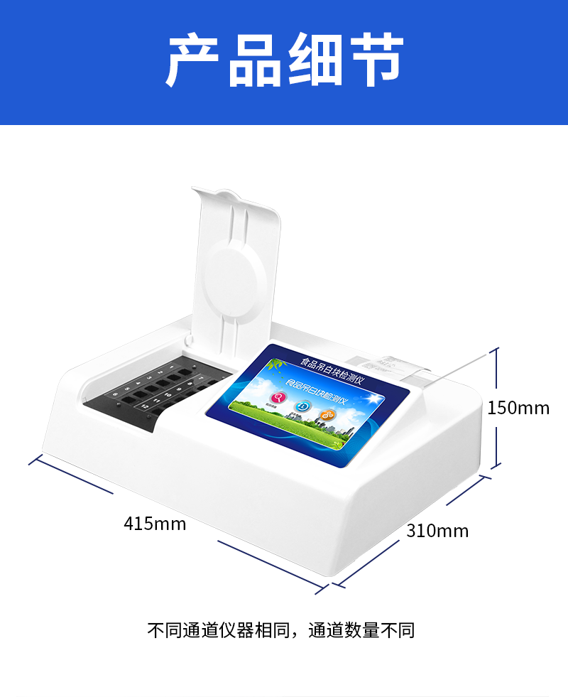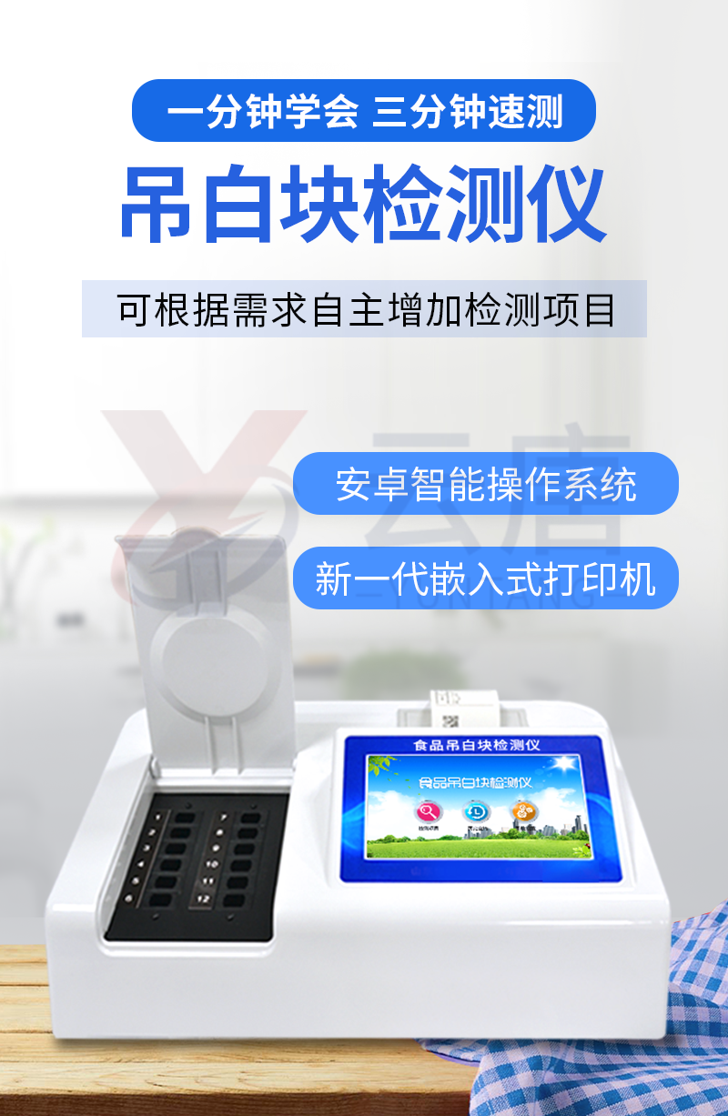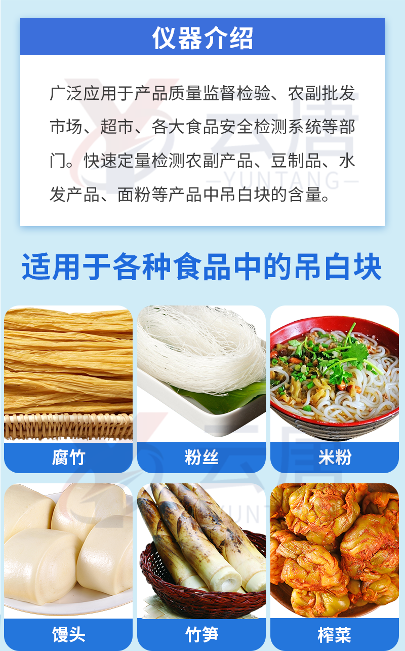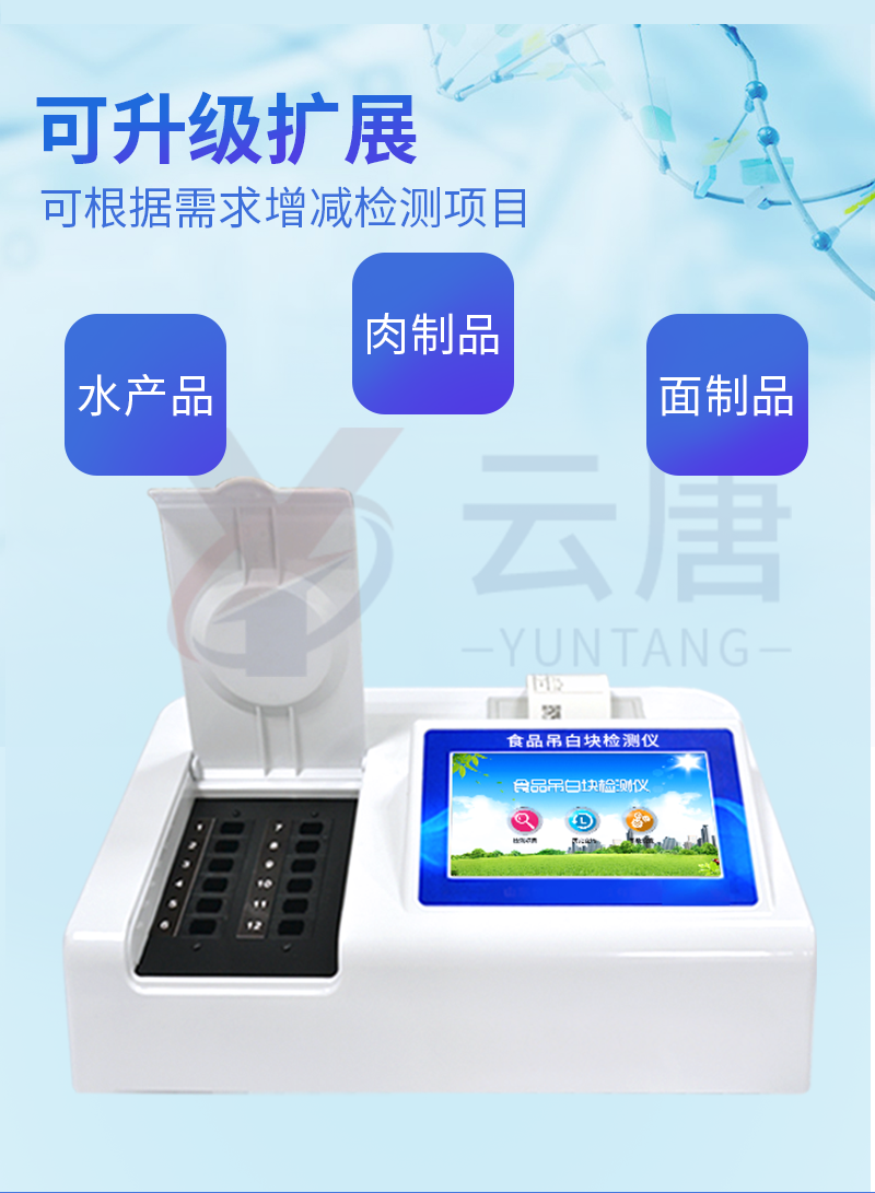 用于快速檢測食品中吊白塊,儀器預留其他項目檢測程序和端口,根據(jù)日后需求可方便的自主增加檢測項目。日后可升級為檢測,水產品,肉制品,面制品的綜合類型儀器。