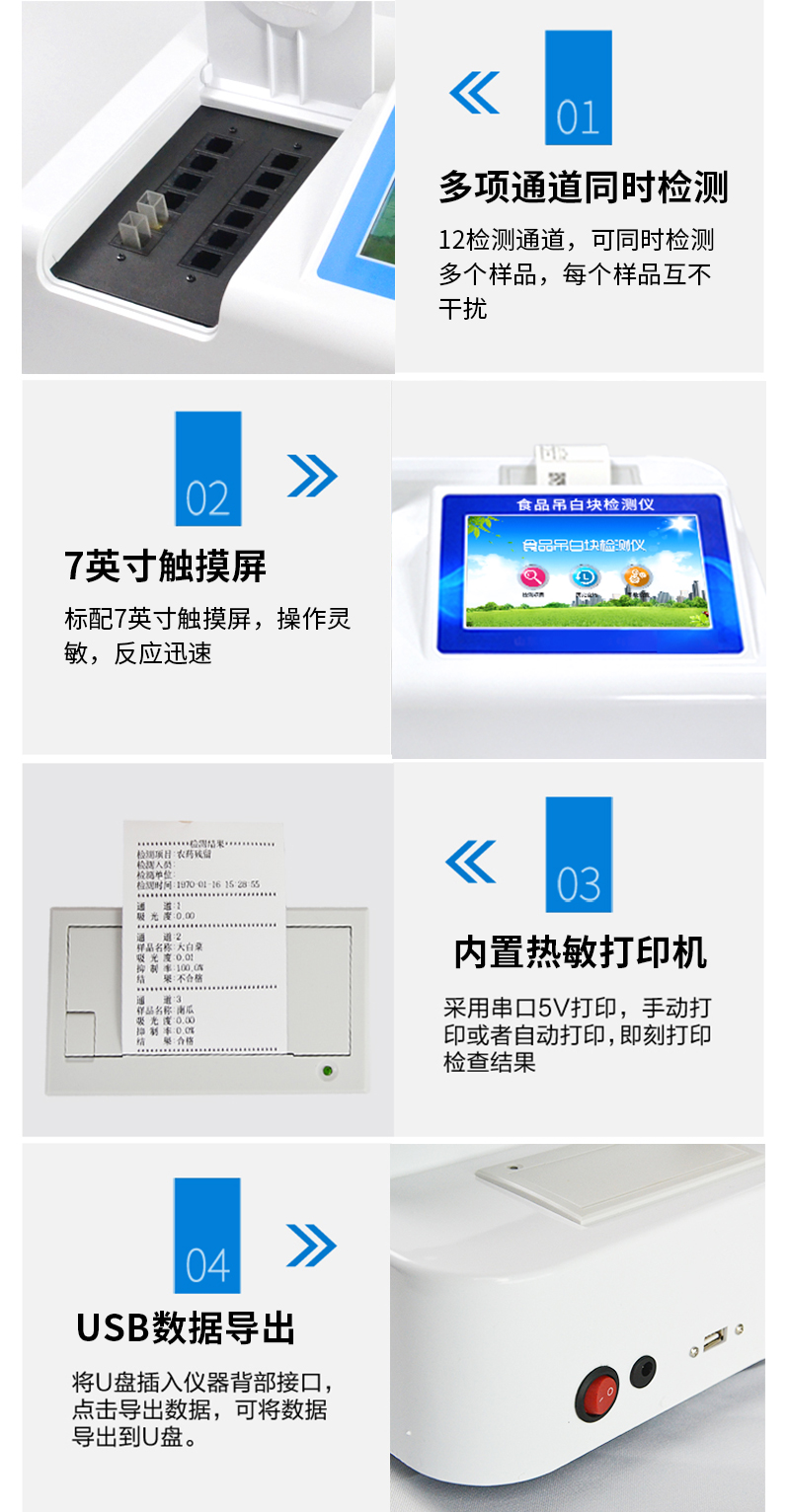 | 儀器采用臺式一體化系統(tǒng)檢測技術,將分光光度模塊、新型農殘檢測模塊、數(shù)字化管理模塊、無線通訊模塊高度集成于一體,支持檢測200種食品安全檢測項目,同時預留升級檢測方法。 | 儀器檢測模塊標準化、智能化,可隨意自由組合。檢測箱體內置多個標準檢測單元,檢測模塊可以調整配置。 | 儀器采用全新安卓智能系統(tǒng),主控芯片采用 ARM Cortex-A7,RK3288/4核處理器,10.1寸高清液晶觸摸豎屏,更加**的UI交互界面,運轉快捷;儀器配備無線通信模塊: 4G(APN)通訊模塊、Wifi模塊,藍牙傳輸,同時具有雙USB接口以及RJ45接口能以多種方式實現(xiàn)數(shù)據(jù)保存和數(shù)據(jù)傳輸功能。 | 創(chuàng)新檢測模式: | ★檢測通道:≥12通道;采用精密旋轉比色池設計,使用同芯片同光源校準精度,解決不同光源之間的誤差值。1-12通道間誤差0.1%。(***:**202022821055.2) | ★儀器具有自動識別比色皿檢測功能,即:將樣品比色皿放入儀器后,點擊樣品檢測,儀器自動識別比色皿進行通道檢測。 | 進口高精光源: | 高精度進口四波長冷光源,通道配置 410、520、590、630nm 波長光源,一個光源芯片驅動一個光源,誤差極小,每臺設備單獨**校準光源,**比對,同時參照四種不同波段光源全方位覆蓋市面上99%的農殘食品項目檢測。 | 智能化操作系統(tǒng): | 便捷操作系統(tǒng):設備檢測時可在同一檢測界面自動對應相關檢測通道一次性選擇1-12個樣品名稱,無須退出界面,節(jié)省操作時間。 | 數(shù)據(jù)集成系統(tǒng):設備首頁自動統(tǒng)計檢測數(shù)據(jù)包含:周檢測數(shù)據(jù)、月檢測數(shù)據(jù),全部檢測總數(shù)量,均包含檢測總數(shù),合格數(shù),不合格數(shù),以及相關柱形分析圖,對各項檢測數(shù)據(jù)清晰掌握,無需電腦查詢,更加快捷直觀。 | 項目預設系統(tǒng):支持添加單個及多個相同或不相同的任務預設,一鍵快速調取,每一個任務分別可以設置不同的樣品、批次、編號、來源、備注、抽樣信息、檢測信息、受檢信息、復核信息等更多信息。無縫鏈接平臺和APP實時查看下發(fā)任務。 | 數(shù)據(jù)監(jiān)管系統(tǒng):同步對接監(jiān)管平臺,數(shù)據(jù)可局域網(wǎng)和互聯(lián)網(wǎng)數(shù)據(jù)上傳,檢測結果可選擇直接傳至食品安全監(jiān)管平臺。集成OSS輸出存儲服務、區(qū)分設備定向管理應用,進行區(qū)域食品安全監(jiān)管及大數(shù)據(jù)分析處理與數(shù)據(jù)統(tǒng)計,檢測區(qū)域食品安全長短期動態(tài),達到食品安全問題預估、預警。 | 自定義打印系統(tǒng):內置全新打印系統(tǒng),新創(chuàng)自定義打印方式,可按需靈活設置開啟或關閉:產品合格證(國家農業(yè)部標準要求),二維碼,抽樣信息、檢測信息,受檢信息、復核信息、抽樣日期、檢測日期等信息的打印。 | 系統(tǒng)遠程更新功能:可定向分客戶分儀器更新系統(tǒng),按照不同客戶后期實際需求添加項目,無需機器返廠,即可遠程實時升級全新系統(tǒng),節(jié)省時間成本及避免運輸造成設備損壞。 | 儀器主機采用一體化防水、抗壓、防撞擊、防腐蝕箱體設計,同時配備交直流供電,可連接車載電源,可選配大容量充電鋰電池,滿足現(xiàn)場野外檢測需求。 | 安全證書,放心保障:儀器具有中國計量科學研究院校準證書,權威認證。 |