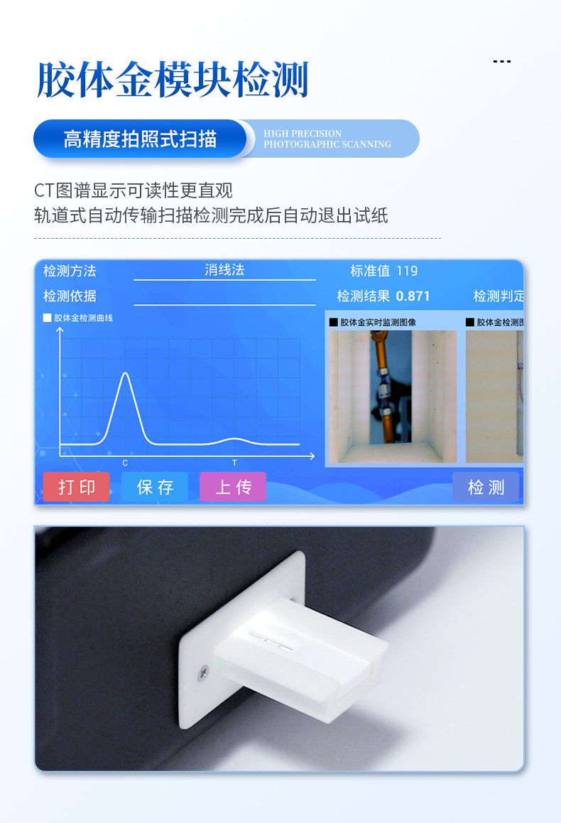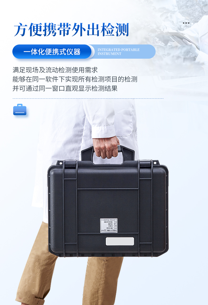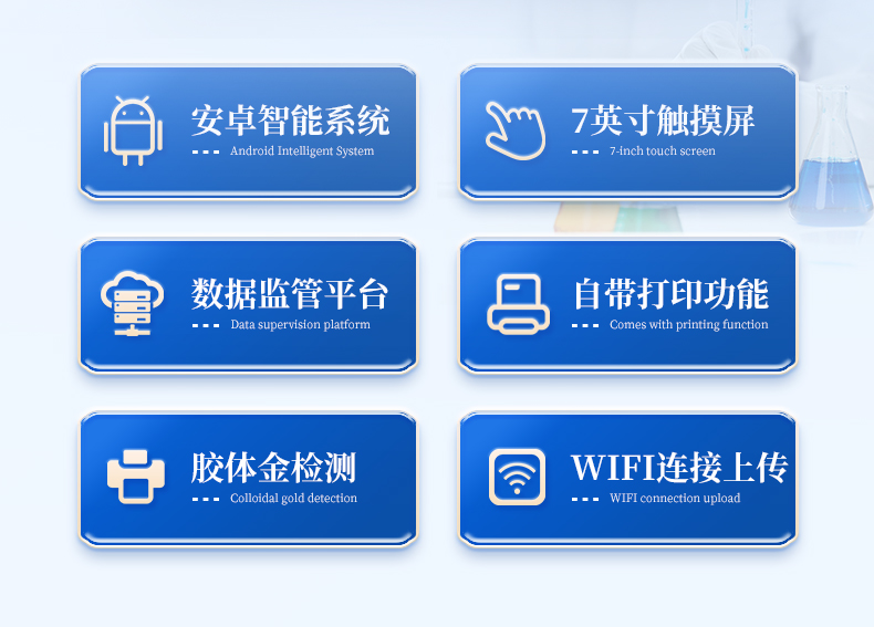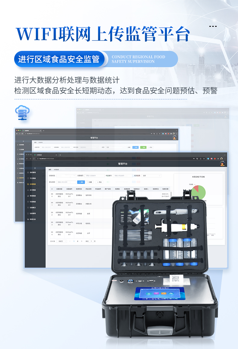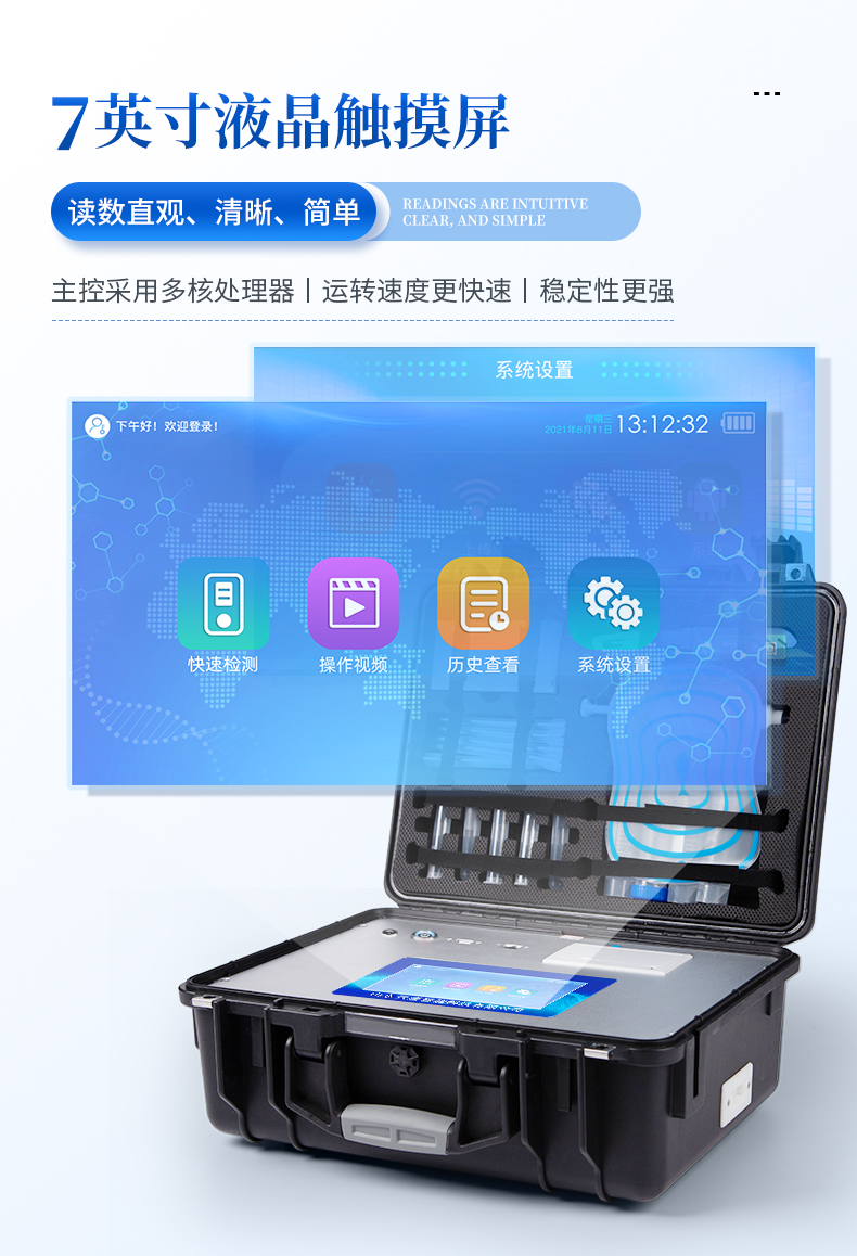 | 機(jī)箱采用工業(yè)級(jí)ABS工程塑料箱,方便攜帶,穩(wěn)固耐用,便于流動(dòng)測(cè)試。 | 安卓智能操作系統(tǒng),采用更加**和人性化操作,儀器具有wifi聯(lián)網(wǎng)上傳、4G聯(lián)網(wǎng)傳輸、GPRS無(wú)線遠(yuǎn)傳、網(wǎng)線連接功能,快速上傳數(shù)據(jù)。 | 智能化程度高,儀器具有自檢功能:具有開(kāi)機(jī)自檢和調(diào)零功能,具有自動(dòng)檢測(cè)重復(fù)性功能。 | 新一代高速熱敏打印機(jī),檢測(cè)完成可自動(dòng)打印檢測(cè)報(bào)告和二維碼。 | 儀器帶有監(jiān)管平臺(tái),數(shù)據(jù)可局域網(wǎng)和互聯(lián)網(wǎng)數(shù)據(jù)上傳,檢測(cè)結(jié)果直接傳至食品安全監(jiān)管平臺(tái)。進(jìn)行區(qū)域食品安全監(jiān)管及大數(shù)據(jù)分析處理與數(shù)據(jù)統(tǒng)計(jì),檢測(cè)區(qū)域食品安全長(zhǎng)短期動(dòng)態(tài),達(dá)到食品安全問(wèn)題預(yù)估、預(yù)警 | 一體化主機(jī),包含食品安全檢測(cè)模塊、多通道農(nóng)藥殘留檢測(cè)模塊、膠體金免疫層析檢測(cè)模塊。 | 一體化便攜式快檢設(shè)備,滿足現(xiàn)場(chǎng)及流動(dòng)檢測(cè)使用需求,能夠在同一軟件下實(shí)現(xiàn)所有檢測(cè)項(xiàng)目的檢測(cè),并可通過(guò)同一窗口直觀顯示檢測(cè)結(jié)果。 | 膠體金模塊檢測(cè)方式:軌道式自動(dòng)傳輸掃描,檢測(cè)完成后自動(dòng)退出檢測(cè)卡。 | CT線自動(dòng)識(shí)別,無(wú)需手動(dòng)調(diào)整。 | 儀器具有品類(lèi)多種類(lèi)樣品菜單庫(kù),可靈活選擇檢測(cè)樣品,不同的檢測(cè)通道可同時(shí)檢測(cè)不同的樣品項(xiàng)目。 | 樣品處理簡(jiǎn)單省力,整體操作快速、安全、便捷。 | 高靈敏度,高檢測(cè)精度,高重復(fù)性精度,掃描式高精度光學(xué)傳感器。 | 內(nèi)置強(qiáng)大的數(shù)據(jù)庫(kù),可在儀器上直接選擇樣品名稱(chēng)、檢測(cè)指標(biāo)、送檢單位等信息,也可在儀器上直接編輯錄入樣品名稱(chēng)、檢測(cè)指標(biāo)、送檢單位等信息并保存進(jìn)樣品數(shù)據(jù)庫(kù)。 | 儀器具有自身保護(hù)功能,可設(shè)置用戶(hù)名及密碼,防止非工作人員操作等。 | 儀器具有重新校準(zhǔn)、鎖定、恢復(fù)出廠設(shè)置功能。 | 支持U盤(pán)存儲(chǔ)。 結(jié)果判定線可修改,對(duì)照值標(biāo)定值可保存,斷電不丟失數(shù)據(jù)。 | 兼容市場(chǎng)上所有的膠體金卡,使用耗材不受限制,極大增強(qiáng)用戶(hù)使用體驗(yàn)。 |
