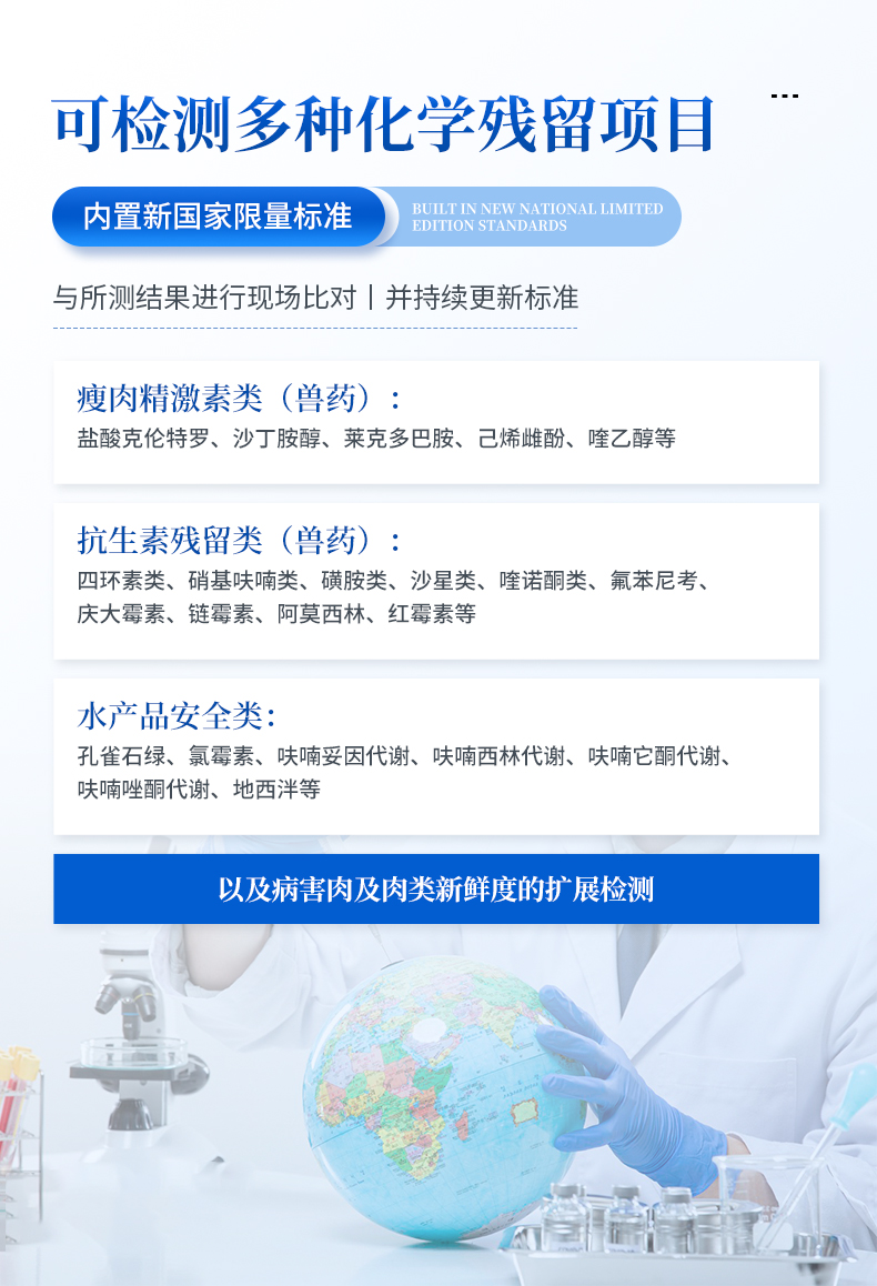 抗生素殘留檢測(cè)儀可現(xiàn)場(chǎng)快速檢測(cè)多類(lèi)別抗生素類(lèi)殘留,如可快速檢測(cè)四環(huán)素類(lèi)、硝基呋喃類(lèi)、磺胺類(lèi)、沙星類(lèi)、喹諾酮類(lèi)、氯霉素、慶大霉素、鏈霉素、喹乙醇代謝物、硫酸鏈霉素、羧芐青霉素、噻孢菌素鈉、阿莫西林、氨芐西林、紅霉素、潮霉素B、安普霉紊、桿菌肽、氨丙琳、芐青霉家、頭孢噻呋、克拉維酸、氯羥吡啶、阿散酸等抗生素快速檢測(cè);水產(chǎn)獸藥:呋喃妥因代謝、呋喃西林代謝、呋喃它酮代謝、呋喃唑酮代謝、孔雀石綠等。