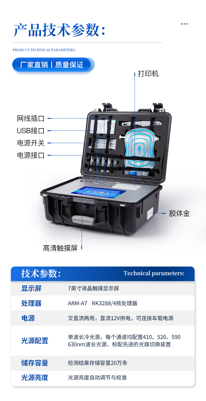 | 主控芯片采用ARM Cortex-A7,RK3288/4核處理器,主頻1.88Ghz,運(yùn)轉(zhuǎn)速度更快速,穩(wěn)定性更強(qiáng)。 | 顯示方式:7英寸液晶觸摸屏顯示,人性化中文操作界面,讀數(shù)直觀、簡(jiǎn)單。 | 交直流兩用,直流12V供電,可連接車(chē)載電源,可配6ah大容量充電鋰電池,方便戶(hù)外流動(dòng)測(cè)試。 | 光源亮度自動(dòng)調(diào)節(jié)與校準(zhǔn) | 智能恒流穩(wěn)壓,光強(qiáng)自動(dòng)校準(zhǔn),長(zhǎng)時(shí)間連續(xù)工作光源無(wú)溫漂現(xiàn)象。 | 內(nèi)置新國(guó)家限量標(biāo)準(zhǔn),與所測(cè)結(jié)果進(jìn)行現(xiàn)場(chǎng)比對(duì),并持續(xù)更新標(biāo)準(zhǔn)。 | 不間斷進(jìn)樣,連續(xù)檢測(cè) | 樣本編號(hào)自動(dòng)累加。 | 檢測(cè)項(xiàng)目可擴(kuò)充。 | 檢測(cè)結(jié)果可批量打印,批量上傳。 | 檢測(cè)結(jié)果為Excel表格,連接電腦即可拷貝。 | 檢測(cè)結(jié)果存儲(chǔ)容量20萬(wàn)條 | 標(biāo)準(zhǔn)USB接口,免驅(qū)動(dòng)安裝。 | 固件可升級(jí)。 |