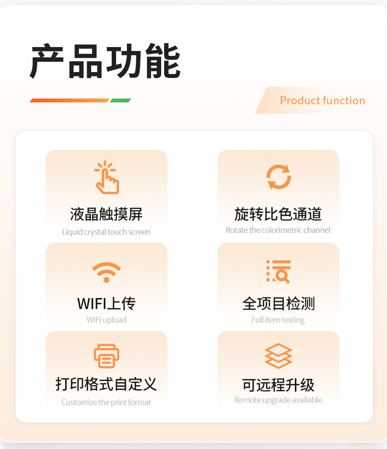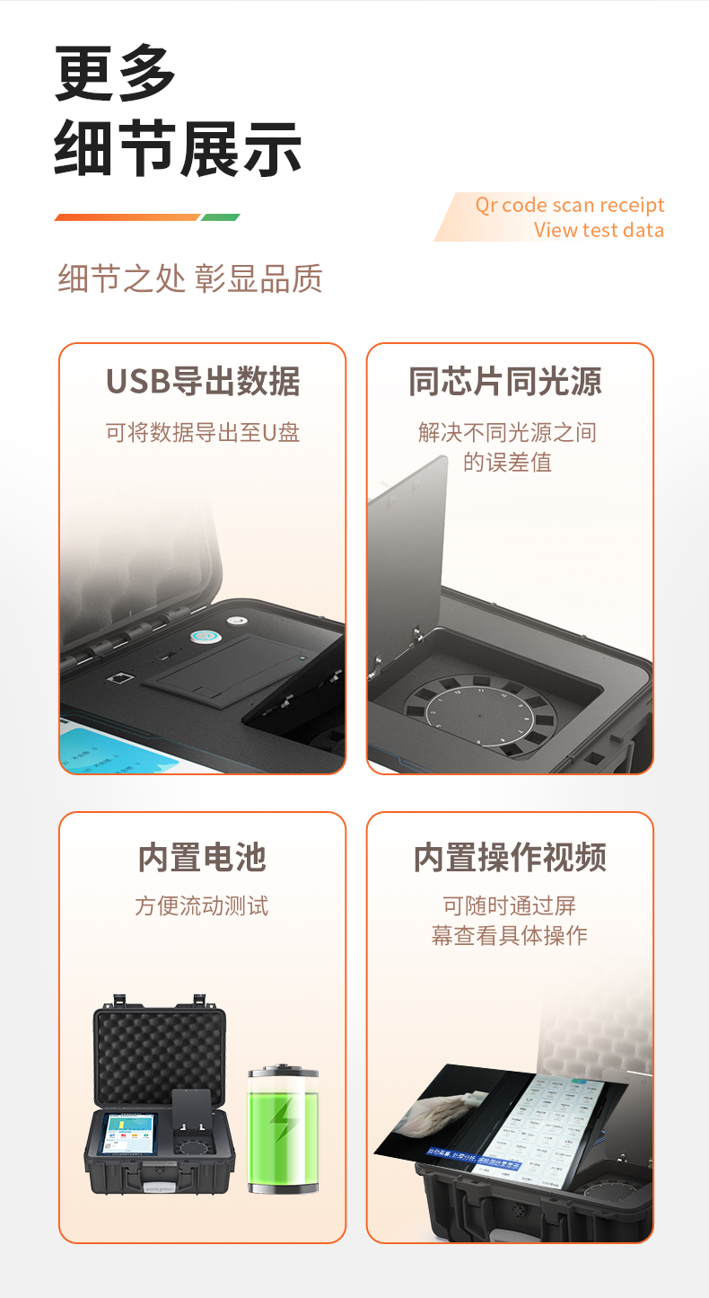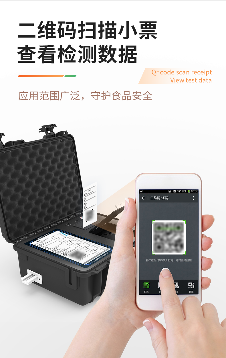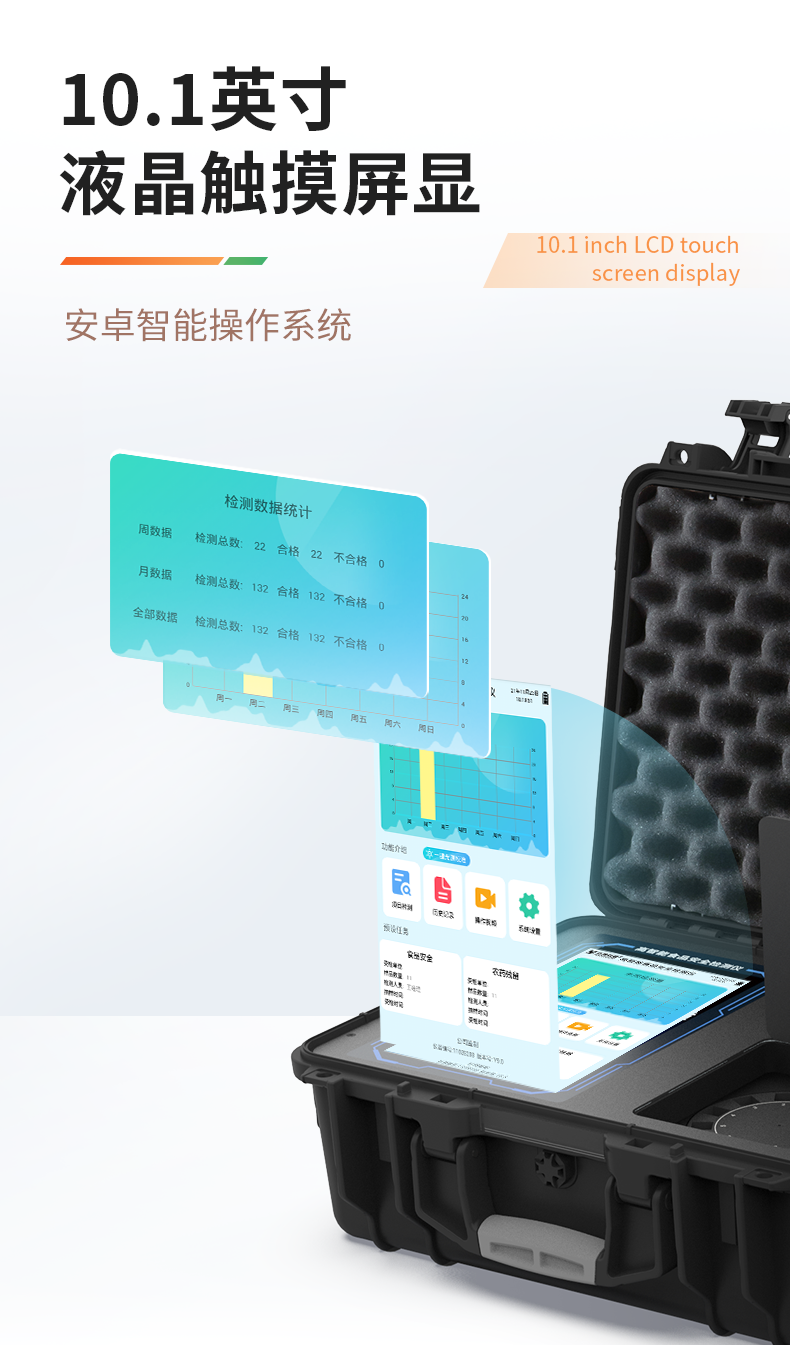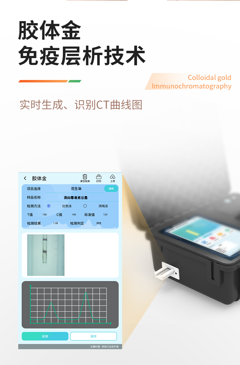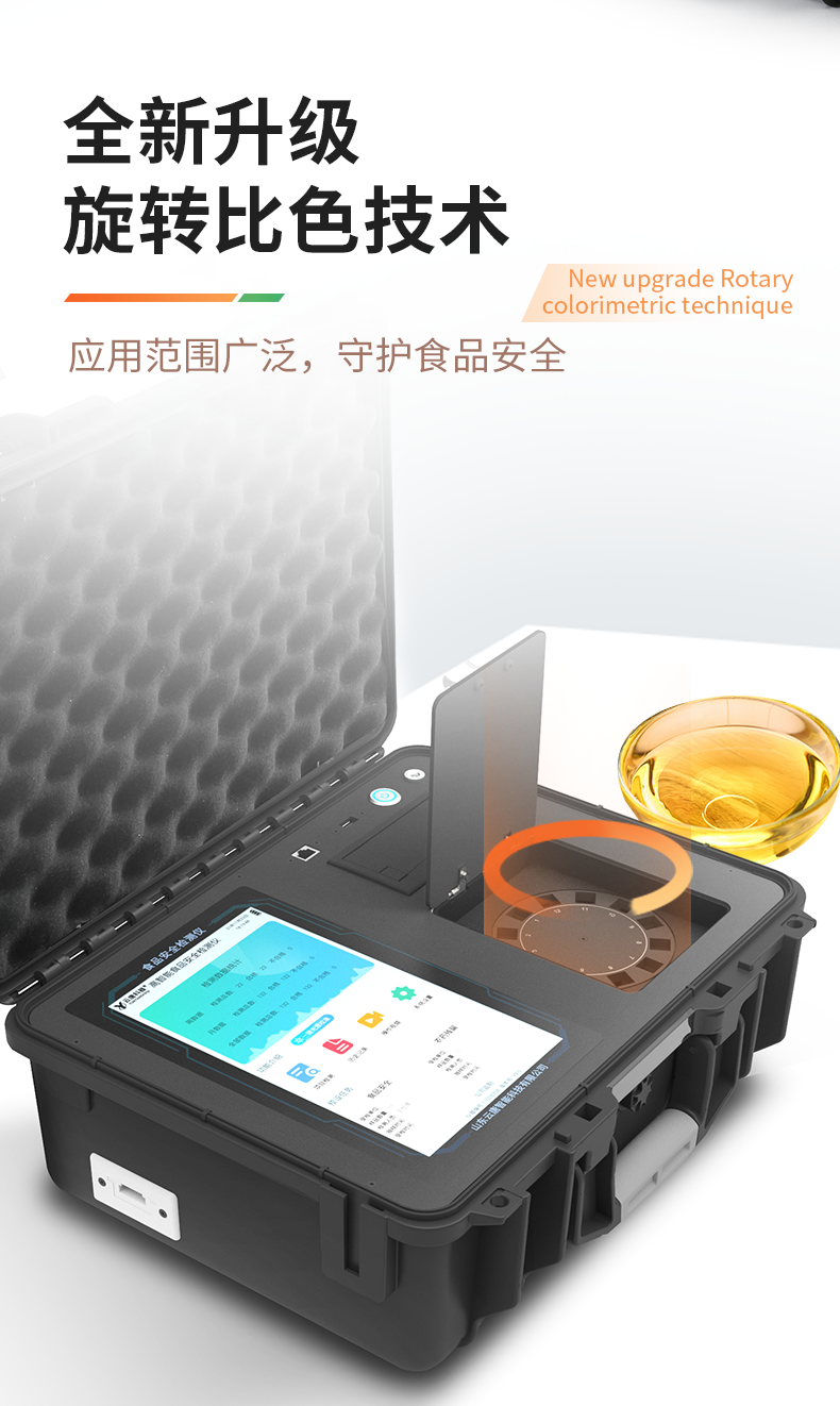 | 1、儀器采用手提一體化系統(tǒng)檢測(cè)技術(shù),將分光光度模塊、膠體金檢測(cè)模塊、新型農(nóng)殘檢測(cè)模塊、數(shù)字化管理模塊、無(wú)線通訊模塊高度集成于一體,支持檢測(cè)200種食品安全檢測(cè)項(xiàng)目,同時(shí)預(yù)留升級(jí)檢測(cè)方法。 | 2、儀器檢測(cè)模塊標(biāo)準(zhǔn)化、智能化,檢測(cè)項(xiàng)目可隨意自由組合。檢測(cè)箱體內(nèi)置多個(gè)標(biāo)準(zhǔn)檢測(cè)單元,檢測(cè)模塊可以調(diào)整配置。 | 3、顯示屏幕:儀器采用10.1英寸豎向液晶觸摸屏顯,搭配運(yùn)行安卓智能操作系統(tǒng),主控芯片采用ARM Cortex-A7,RK3288/4核處理器,主頻1.88Ghz,操作方便,性能更強(qiáng)。 | 4、檢測(cè)通道:≥12通道;采用精密旋轉(zhuǎn)比色池設(shè)計(jì),使用同芯片同光源校準(zhǔn)精度,解決不同光源之間的誤差值,更加準(zhǔn)確**。(1-12通道間誤差0.1%,***:**202022821055.2) | 5、儀器光源:高精度進(jìn)口四波長(zhǎng)冷光源,每個(gè)通道均配置 410、520、590、630nm 波長(zhǎng)光源,標(biāo)配**的光路切換裝置,專利光路切換功能可實(shí)現(xiàn)64波長(zhǎng),并且所有檢測(cè)項(xiàng)目可實(shí)現(xiàn)所有通道同時(shí)檢測(cè)。 | 6、設(shè)備可一鍵校準(zhǔn),自動(dòng)保存校準(zhǔn)數(shù)據(jù),自動(dòng)對(duì)比校驗(yàn),得到精準(zhǔn)光源,采用Android SP存儲(chǔ)數(shù)據(jù),光源數(shù)據(jù)永不丟失,方便每一次使用。 | 7、通訊接口:配備無(wú)線通信模塊、4G(APN)通訊模塊、藍(lán)牙傳輸,同時(shí)具有雙USB接口以及RJ45網(wǎng)線接口,可以多方式實(shí)現(xiàn)數(shù)據(jù)保存及數(shù)據(jù)傳輸。 | 8、存儲(chǔ)方式:支持U盤存儲(chǔ),標(biāo)準(zhǔn)USB接口,免驅(qū)動(dòng)安裝。檢測(cè)結(jié)果存儲(chǔ)容量20萬(wàn)條以上,可生成Excel表格進(jìn)行拷貝,并具有登錄保護(hù)功能。 | 9、智能化操作系統(tǒng): | 9.1、操作系統(tǒng):儀器可在同一檢測(cè)界面自動(dòng)對(duì)應(yīng)相關(guān)檢測(cè)通道,一次性選擇1-12個(gè)樣品名稱,無(wú)需退出界面,節(jié)省操作時(shí)間。并可以對(duì)每個(gè)通道屬性和樣品信息單獨(dú)進(jìn)行編輯,例如送檢單位、人員,檢測(cè)人員等,打印時(shí)勾選打印顯示。 | 9.2、數(shù)據(jù)集成系統(tǒng):設(shè)備首頁(yè)自動(dòng)匯總分析檢測(cè)數(shù)據(jù),包含:周檢測(cè)數(shù)據(jù)、月檢測(cè)數(shù)據(jù),全部檢測(cè)總數(shù)量,包含檢測(cè)總數(shù),合格數(shù),不合格數(shù),以及相關(guān)柱形分析圖,各項(xiàng)檢測(cè)數(shù)據(jù)一目了然,無(wú)需電腦查詢,更加快捷直觀。 | 9.3、數(shù)據(jù)庫(kù)系統(tǒng):十幾項(xiàng)數(shù)據(jù)庫(kù)分類管理儀器:包含項(xiàng)目類型、項(xiàng)目數(shù)據(jù)、檢測(cè)數(shù)據(jù)、歷史記錄、國(guó)標(biāo)信息、曲線信息、采樣信息、檢測(cè)信息、受檢信息、復(fù)核信息、圖表信息、光源校準(zhǔn)信息、打印樣式信息、樣品庫(kù)信息等等,數(shù)據(jù)庫(kù)之間互相協(xié)調(diào)聯(lián)動(dòng)保證數(shù)據(jù)的真實(shí)完整性。同時(shí)產(chǎn)品數(shù)據(jù)庫(kù)以及歷史檢測(cè)記錄支持一鍵檢索功能。 | 9.4、限量規(guī)判系統(tǒng):具有限量查詢、添加物質(zhì)合規(guī)判定系統(tǒng)。檢測(cè)出結(jié)果后,系統(tǒng)自動(dòng)調(diào)用系統(tǒng)數(shù)據(jù)庫(kù)中相關(guān)國(guó)標(biāo)進(jìn)行比對(duì)判定,客觀顯示判定結(jié)果是否合格。 | 9.5、項(xiàng)目預(yù)設(shè)系統(tǒng):儀器具有任務(wù)預(yù)設(shè)模塊,一鍵提前預(yù)設(shè),給出方便快捷的新檢測(cè)方案,每一個(gè)任務(wù)分別可以設(shè)置不同的樣品、批次、編號(hào)、來(lái)源、備注、抽樣信息、檢測(cè)信息、受檢信息、復(fù)核信息等更多信息。樣品送檢時(shí)一鍵調(diào)取保存信息,并可多次調(diào)取,大大提高檢測(cè)效率。 | 9.6、數(shù)據(jù)監(jiān)管系統(tǒng):同步對(duì)接監(jiān)管平臺(tái),數(shù)據(jù)可局域網(wǎng)和互聯(lián)網(wǎng)數(shù)據(jù)上傳,檢測(cè)結(jié)果可直接傳至食品安全監(jiān)管平臺(tái)。進(jìn)行區(qū)域食品安全監(jiān)管及大數(shù)據(jù)分析處理與數(shù)據(jù)統(tǒng)計(jì),監(jiān)測(cè)區(qū)域食品安全長(zhǎng)短期動(dòng)態(tài)及問(wèn)題預(yù)估、預(yù)警。 | 9.7.1、全新打印系統(tǒng):內(nèi)置全新打印機(jī),新創(chuàng)自定義打印方式,可按需靈活勾選控制:產(chǎn)品合格證(國(guó)家農(nóng)業(yè)部標(biāo)準(zhǔn)要求),二維碼,抽樣信息、檢測(cè)信息,受檢信息、復(fù)核信息、抽樣日期、檢測(cè)日期等信息的打印。 | 9.7.2、A4紙版本報(bào)告打印功能(可選配):設(shè)備擁有兩種結(jié)果展示方式,可以自動(dòng)生成A4打印模板和小票打印模板兩種樣式,可通過(guò)WiFi及網(wǎng)線等方式鏈接外置打印機(jī)可進(jìn)行打印。 | 10、供電模式:儀器交直流兩用,直流12V供電,可連接車載電源,配6ah大容量充電鋰電池,電量可實(shí)時(shí)顯示,方便戶外流動(dòng)測(cè)試。 | 11、膠體金檢測(cè)模塊:采用單通道CMOS成像處理技術(shù)及膠體金免疫層析技術(shù),可讀取膠體金卡數(shù)據(jù),自動(dòng)采集、處理分析,將檢測(cè)結(jié)果顯示,
