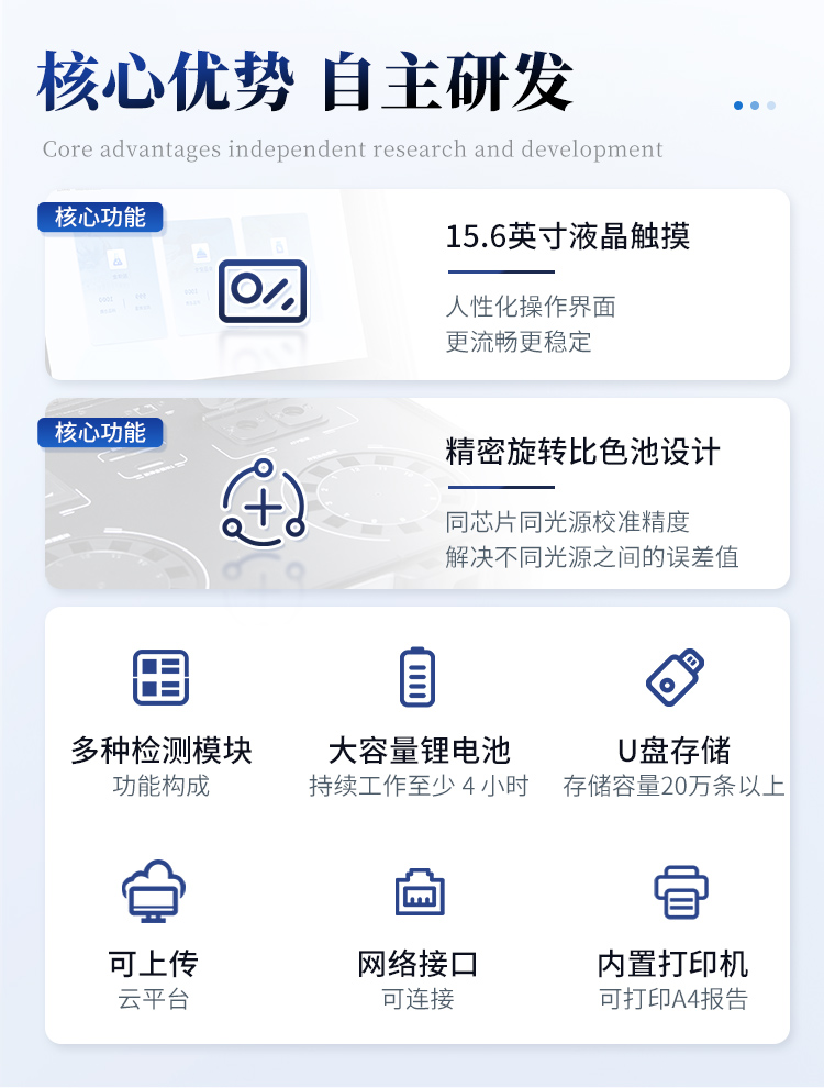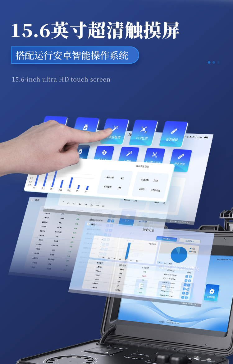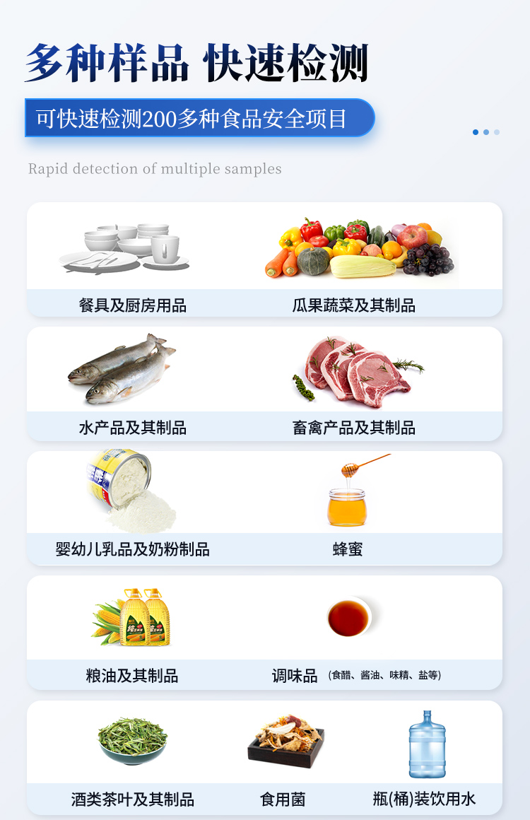 | 儀器采用手提式一體化系統(tǒng)檢測(cè)技術(shù),將分光光度模塊、膠體金檢測(cè)模塊、新型農(nóng)殘檢測(cè)模塊、數(shù)字化管理模塊、無(wú)線(xiàn)通訊模塊高度集成于一體,支持檢測(cè)200種食品安全檢測(cè)項(xiàng)目,同時(shí)預(yù)留升級(jí)檢測(cè)方法。 | 儀器檢測(cè)模塊標(biāo)準(zhǔn)化、智能化,檢測(cè)項(xiàng)目可隨意自由組合。檢測(cè)箱體內(nèi)置多個(gè)標(biāo)準(zhǔn)檢測(cè)單元,檢測(cè)模塊可以調(diào)整配置。 | 顯示屏幕:儀器采用10.1英寸液晶觸摸屏顯,搭配運(yùn)行安卓智能操作系統(tǒng),主控芯片采用ARM Cortex-A7,RK3288/4核處理器,主頻1.88Ghz,運(yùn)轉(zhuǎn)速度更快速,性能更強(qiáng)。 | 檢測(cè)通道:≥12通道;采用精密旋轉(zhuǎn)比色池設(shè)計(jì),使用光源芯片一致,可以解決各通道間由于光源芯片不同帶來(lái)的檢測(cè)結(jié)果誤差問(wèn)題,檢測(cè)結(jié)果更加精準(zhǔn),1-12通道間誤差0.1%,***:**202022821055.2。 | 儀器光源:高精度進(jìn)口四波長(zhǎng)冷光源,每個(gè)通道均配置 410、520、590、630nm 波長(zhǎng)光源,標(biāo)配**的光路切換裝置,專(zhuān)利光路切換功能可實(shí)現(xiàn)*多64波長(zhǎng),并且所有檢測(cè)項(xiàng)目可實(shí)現(xiàn)所有通道同時(shí)檢測(cè) | 設(shè)備具備開(kāi)機(jī)自動(dòng)校準(zhǔn)及一鍵校準(zhǔn)功能,確保檢測(cè)數(shù)據(jù)結(jié)果準(zhǔn)確。 | 通訊接口:配備無(wú)線(xiàn)通信模塊、4G(APN)通訊模塊、藍(lán)牙傳輸,同時(shí)具有雙USB接口以及RJ45網(wǎng)線(xiàn)接口,可以多方式實(shí)現(xiàn)數(shù)據(jù)保存及數(shù)據(jù)傳輸。 | 存儲(chǔ)方式:支持U盤(pán)存儲(chǔ),標(biāo)準(zhǔn)USB接口,免驅(qū)動(dòng)安裝。檢測(cè)結(jié)果存儲(chǔ)容量20萬(wàn)條以上,可生成Excel表格進(jìn)行拷貝,并具有登錄保護(hù)功能。 | 智能化操作系統(tǒng): 操作系統(tǒng):可在同一檢測(cè)界面自動(dòng)對(duì)應(yīng)相關(guān)檢測(cè)通道,一次性選擇1-12個(gè)樣品名稱(chēng),無(wú)需退出界面,節(jié)省操作時(shí)間。檢測(cè)通道可以分別打開(kāi)與關(guān)閉并對(duì)檢測(cè)通道屬性和樣品信息進(jìn)行編輯,例如送檢單位、人員,檢測(cè)人員等,打印時(shí)一并顯示。 數(shù)據(jù)集成系統(tǒng):設(shè)備首頁(yè)自動(dòng)統(tǒng)計(jì)檢測(cè)數(shù)據(jù),包含:周檢測(cè)數(shù)據(jù)、月檢測(cè)數(shù)據(jù),全部檢測(cè)總數(shù)量,均包含檢測(cè)總數(shù),合格數(shù),不合格數(shù),以及相關(guān)柱形分析圖,對(duì)各項(xiàng)檢測(cè)數(shù)據(jù)清晰掌握,無(wú)需電腦查詢(xún),更加快捷直觀。 數(shù)據(jù)庫(kù)系統(tǒng):具有多品類(lèi)多種類(lèi)樣品菜單功能,并且構(gòu)建了完善的檢索、修訂功能。食品庫(kù)涵蓋多種菜單庫(kù)100多種蔬菜名稱(chēng),可按需添加或刪除、編輯蔬菜名稱(chēng);不同的檢測(cè)通道可同時(shí)檢測(cè)不同的樣品,產(chǎn)品數(shù)據(jù)庫(kù)以及歷史檢測(cè)記錄支持一鍵檢索功能。 限量規(guī)判系統(tǒng):具有限量查詢(xún)、添加物質(zhì)合規(guī)判定系統(tǒng)。檢測(cè)出結(jié)果后,系統(tǒng)自動(dòng)調(diào)用系統(tǒng)數(shù)據(jù)庫(kù)中相關(guān)國(guó)標(biāo)進(jìn)行比對(duì)判定,客觀顯示判定結(jié)果是否合格。 項(xiàng)目預(yù)設(shè)系統(tǒng):儀器具有任務(wù)預(yù)設(shè)模塊,可在樣品送檢前提前預(yù)設(shè)樣品名稱(chēng)、檢測(cè)指標(biāo)、送檢單位、檢測(cè)單位等信息,樣品送檢時(shí)一鍵調(diào)取保存信息,并可多次調(diào)取,大大提高檢測(cè)效率。 數(shù)據(jù)監(jiān)管系統(tǒng):同步對(duì)接監(jiān)管平臺(tái),數(shù)據(jù)可局域網(wǎng)和互聯(lián)網(wǎng)數(shù)據(jù)上傳,檢測(cè)結(jié)果可選擇直接傳至食品安全監(jiān)管平臺(tái)。進(jìn)行區(qū)域食品安全監(jiān)管及大數(shù)據(jù)分析處理與數(shù)據(jù)統(tǒng)計(jì),檢測(cè)區(qū)域食品安全長(zhǎng)短期動(dòng)態(tài),達(dá)到食品安全問(wèn)題預(yù)估、預(yù)警。 自定義打印系統(tǒng):內(nèi)置熱敏打印機(jī);系統(tǒng)打印格式多樣化,產(chǎn)品合格證(國(guó)家農(nóng)業(yè)部標(biāo)準(zhǔn)要求),二維碼,抽樣信息、檢測(cè)信息,受檢信息、復(fù)核信息、抽樣日期、檢測(cè)日期等信息結(jié)果,可按實(shí)際需求自行設(shè)置開(kāi)啟或關(guān)閉,并完成打印。 | 供電模式:儀器主機(jī)采用一體化防水、抗壓、防撞擊、防腐蝕機(jī)體設(shè)計(jì),可直接使用交流電源;內(nèi)置6ah大容量充電鋰電池,可連續(xù)使用8小時(shí)以上,滿(mǎn)足脫電情況下檢測(cè)需求。 | 膠體金檢測(cè)模塊: 采用雙通道CMOS成像處理技術(shù)及膠體金免疫層析技術(shù),可同時(shí)讀取雙膠體金卡數(shù)據(jù),自動(dòng)采集、處理分析,將檢測(cè)結(jié)果顯示,并可根據(jù)參考限值自動(dòng)判斷檢測(cè)結(jié)果,可檢測(cè)常見(jiàn)的獸藥殘留、生物毒素、抗生素、違禁添加物等。 探測(cè)技術(shù):CMOS成像探測(cè); 檢測(cè)通道:3通道,可同時(shí)讀取3個(gè)膠體金卡數(shù)據(jù); 檢測(cè)方式:消線(xiàn)法和比色法; 顯示模式:陰性或陽(yáng)性; 曲線(xiàn)形式:軌道式自動(dòng)傳輸掃描方式,可