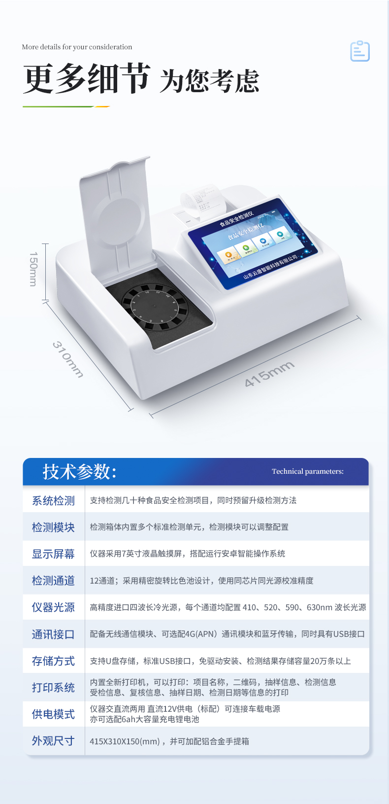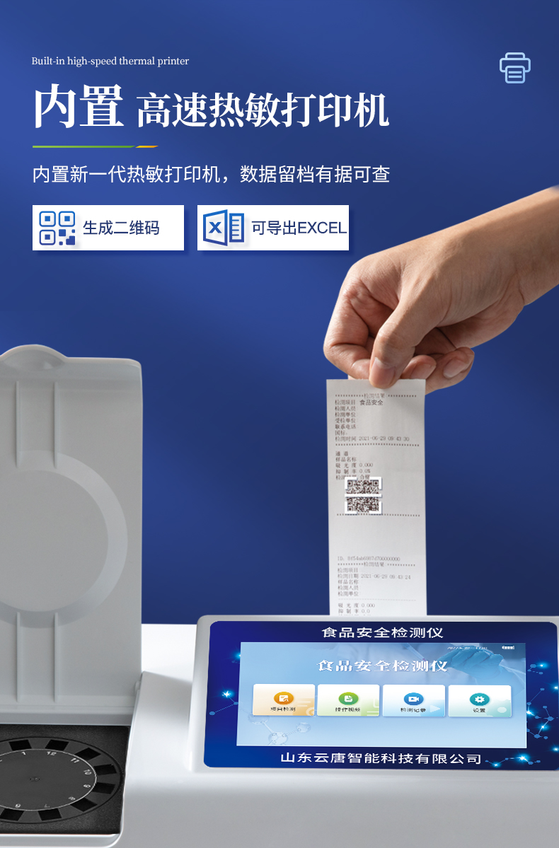 8.3、數(shù)據(jù)監(jiān)管系統(tǒng):同步對接監(jiān)管平臺,數(shù)據(jù)可局域網(wǎng)和互聯(lián)網(wǎng)數(shù)據(jù)上傳,檢測結(jié)果可選擇直接傳至食品安全監(jiān)管平臺。進(jìn)行區(qū)域食品安全監(jiān)管及大數(shù)據(jù)分析處理與數(shù)據(jù)統(tǒng)計,檢測區(qū)域食品安全長短期動態(tài),達(dá)到食品安全問題預(yù)估、預(yù)警。8.4、打印系統(tǒng):內(nèi)置全新打印機(jī),可以打印:項目名稱,二維碼,抽樣信息、檢測信息,受檢信息、復(fù)核信息、抽樣日期、檢測日期等信息的打印。