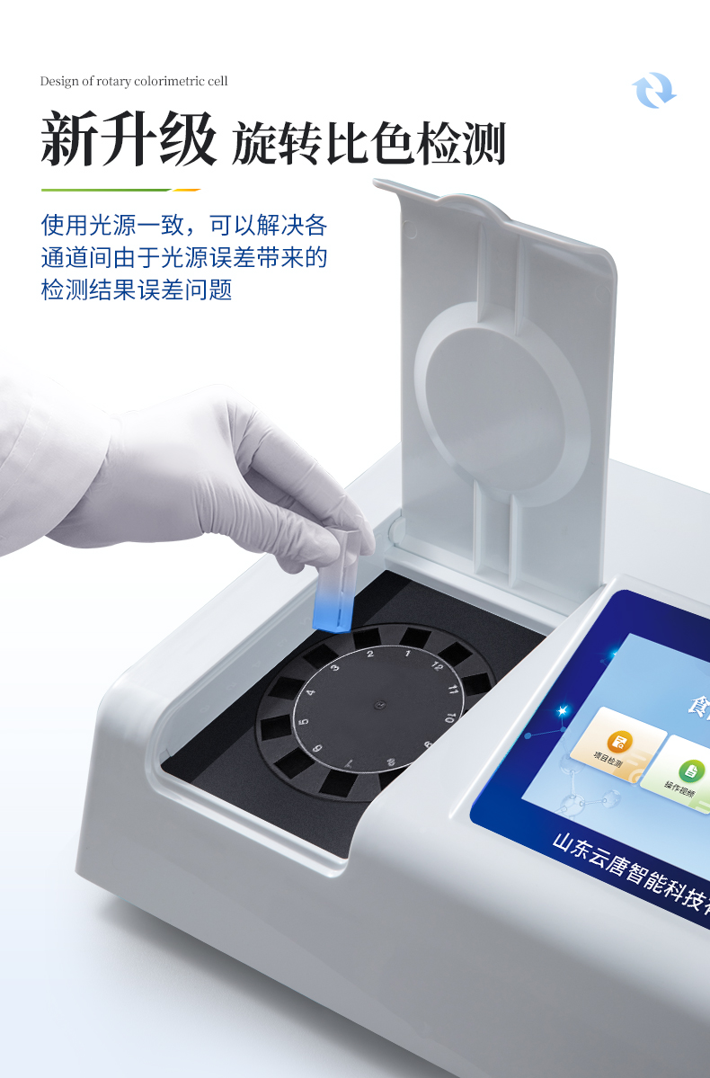 4、檢測通道:12通道;采用精密旋轉(zhuǎn)比色池設(shè)計,使用同芯片同光源校準(zhǔn)精度,解決不同光源之間的誤差值,更加準(zhǔn)確**。