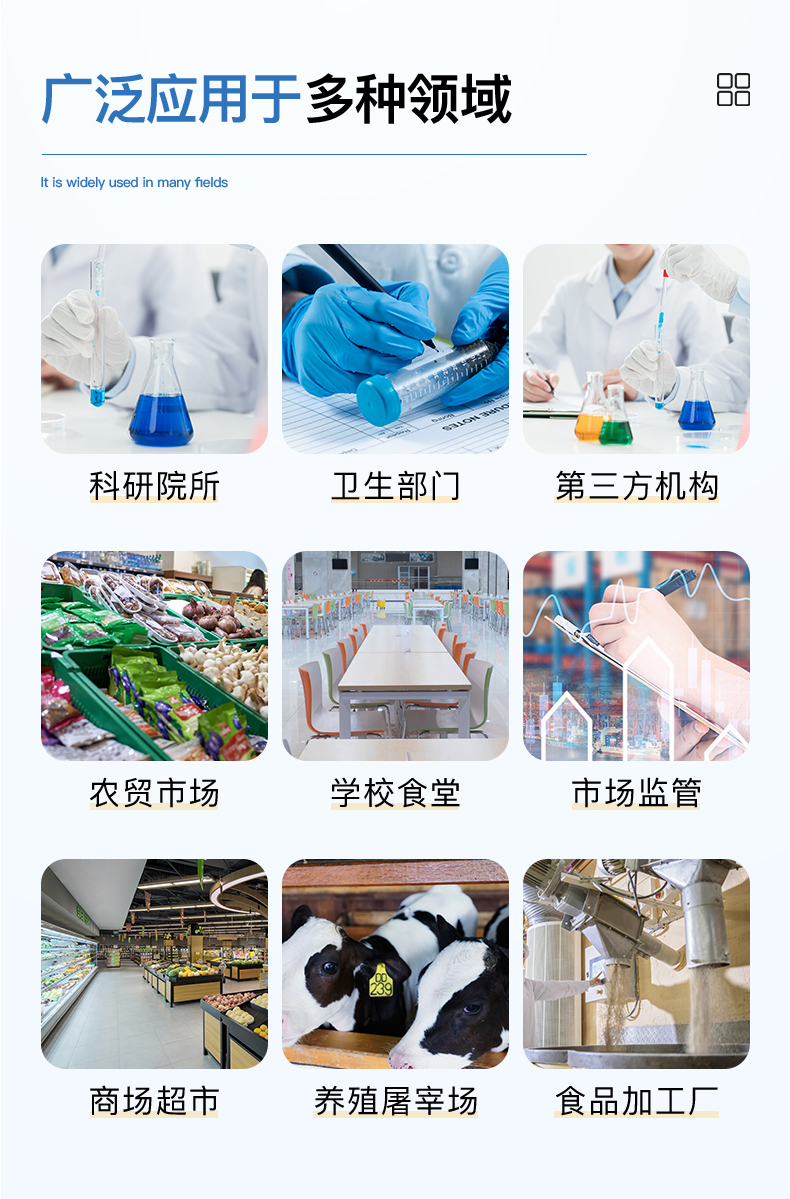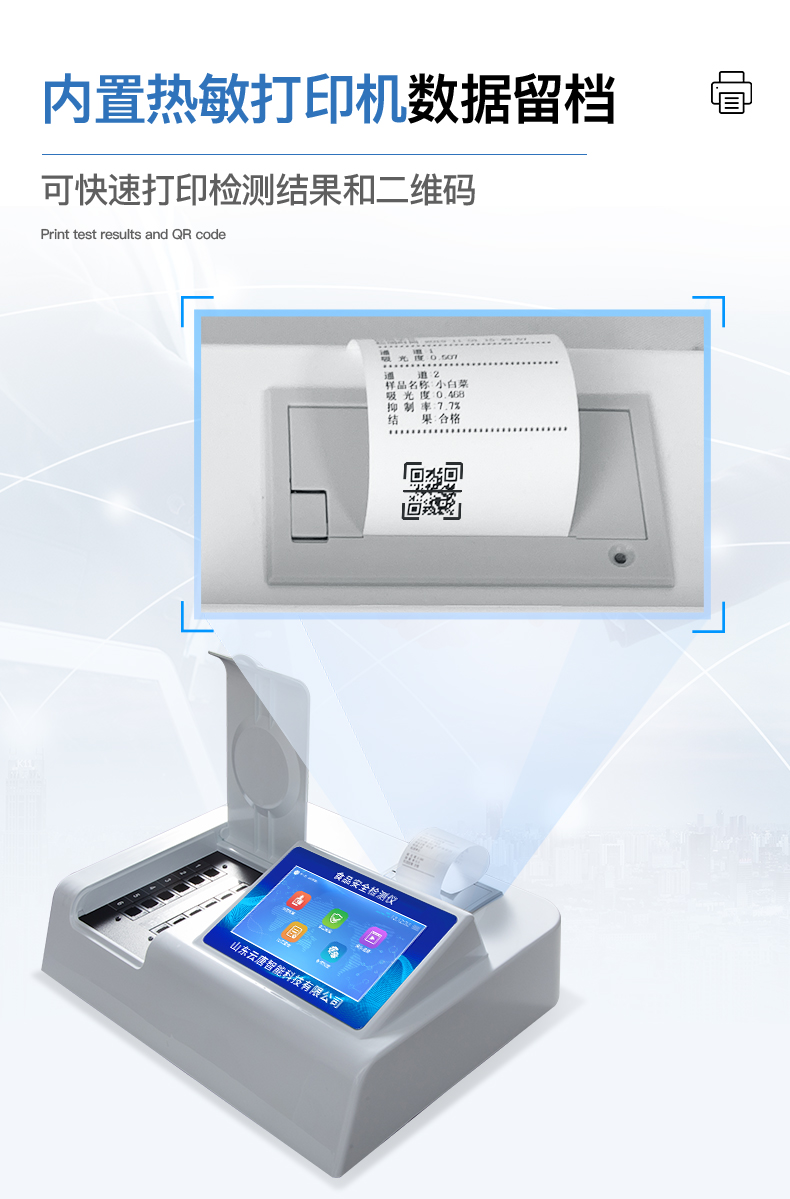 | 儀器采用臺式一體化系統檢測技術,將分光光度模塊、新型農殘檢測模塊、數字化管理模塊、無線通訊模塊高度集成于一體,支持檢測200種食品安全檢測項目,同時預留升級檢測方法。 | 儀器檢測模塊標準化、智能化,可隨意自由組合。檢測箱體內置多個標準檢測單元,檢測模塊可以調整配置。 | 儀器采用全新安卓智能系統,主控芯片采用 ARM Cortex-A7,RK3288/4核處理器,10.1寸高清液晶觸摸豎屏,更加**的UI交互界面,運轉快捷;儀器配備無線通信模塊: 4G(APN)通訊模塊、Wifi模塊,藍牙傳輸,同時具有雙USB接口以及RJ45接口能以多種方式實現數據保存和數據傳輸功能。 | 創新檢測模式: | ★檢測通道:≥12通道;采用精密旋轉比色池設計,使用同芯片同光源校準精度,解決不同光源之間的誤差值。1-12通道間誤差0.1%。(***:**202022821055.2) | ★儀器具有自動識別比色皿檢測功能,即:將樣品比色皿放入儀器后,點擊樣品檢測,儀器自動識別比色皿進行通道檢測。 | 進口高精光源: | 高精度進口四波長冷光源,通道配置 410、520、590、630nm 波長光源,一個光源芯片驅動一個光源,誤差極小,每臺設備單獨**校準光源,**比對,同時參照四種不同波段光源全方位覆蓋市面上99%的農殘食品項目檢測。 | 智能化操作系統: | 便捷操作系統:設備檢測時可在同一檢測界面自動對應相關檢測通道一次性選擇1-12個樣品名稱,無須退出界面,節省操作時間。 | 數據集成系統:設備首頁自動統計檢測數據包含:周檢測數據、月檢測數據,全部檢測總數量,均包含檢測總數,合格數,不合格數,以及相關柱形分析圖,對各項檢測數據清晰掌握,無需電腦查詢,更加快捷直觀。 | 項目預設系統:支持添加單個及多個相同或不相同的任務預設,一鍵快速調取,每一個任務分別可以設置不同的樣品、批次、編號、來源、備注、抽樣信息、檢測信息、受檢信息、復核信息等更多信息。無縫鏈接平臺和APP實時查看下發任務。 | 數據監管系統:同步對接監管平臺,數據可局域網和互聯網數據上傳,檢測結果可選擇直接傳至食品安全監管平臺。集成OSS輸出存儲服務、區分設備定向管理應用,進行區域食品安全監管及大數據分析處理與數據統計,檢測區域食品安全長短期動態,達到食品安全問題預估、預警。 | 自定義打印系統:內置全新打印系統,新創自定義打印方式,可按需靈活設置開啟或關閉:產品合格證(國家農業部標準要求),二維碼,抽樣信息、檢測信息,受檢信息、復核信息、抽樣日期、檢測日期等信息的打印。 | 系統遠程更新功能:可定向分客戶分儀器更新系統,按照不同客戶后期實際需求添加項目,無需機器返廠,即可遠程實時升級全新系統,節省時間成本及避免運輸造成設備損壞。 | 儀器主機采用一體化防水、抗壓、防撞擊、防腐蝕箱體設計,同時配備交直流供電,可連接車載電源,可選配大容量充電鋰電池,滿足現場野外檢測需求。 | 安全證書,放心保障:儀器具有中國計量科學研究院校準證書,權威認證。 |